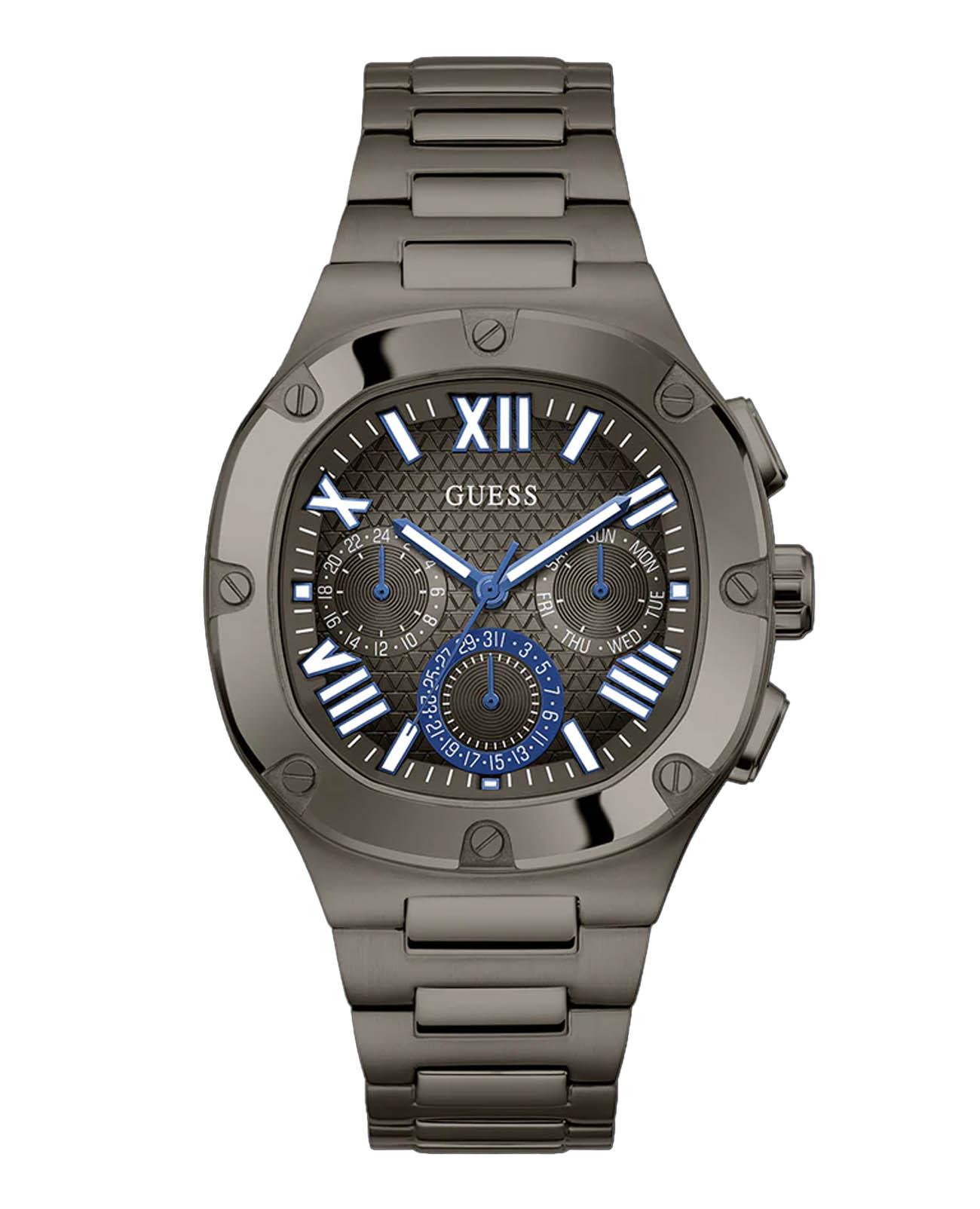 Мужские наручные часы с минеральным стекломМинеральное стеклоМинеральное стекло представляет собой искусственно выращенный минерал кварца. Такое стекло отличается особой устойчивостью к повреждениям и царапинам. Уступает по некоторым качествам сапфировому стеклу. Guess Dress  GW0572G5, кварцевый механизм с высокой точностью. Корпус часов изготовлен из стали с IP-покрытиемIP-покрытиеМетод ионного напыления. Демонстрирует повышенную устойчивость к истиранию, окислению и химическим веществам. Под воздействием высокого давления и температуры около 1500°C молекулы металла надёжно соединяются с частицами корпуса часов.. 24-х часовой формат времени, число и день недели отображаются на отдельных циферблатах. Стрелки и метки с люминесцентным покрытиемЛюминесцентное покрытиеПозволяет считывать показания времени в темноте. Производители наносят на стрелки, часовые индексы, безель или поверхность циферблата светонакопительный состав, дающий холодное свечение.. Класс водозащиты: 50 метров, позволит защитить корпус от случайных брызг или капель дождя. Стальной браслет с IP-покрытиемIP-покрытиеМетод ионного напыления. Демонстрирует повышенную устойчивость к истиранию, окислению и химическим веществам. Под воздействием высокого давления и температуры около 1500°C молекулы металла надёжно соединяются с частицами корпуса часов. на раскладной застёжкеРаскладная застёжкаТакой тип застёжки используется только на браслетах из металла. Она никогда не раскрывается полностью, происходит разделение на 2 и более частей. Раскладывающая застёжка снизит вероятность потери часов к минимуму..