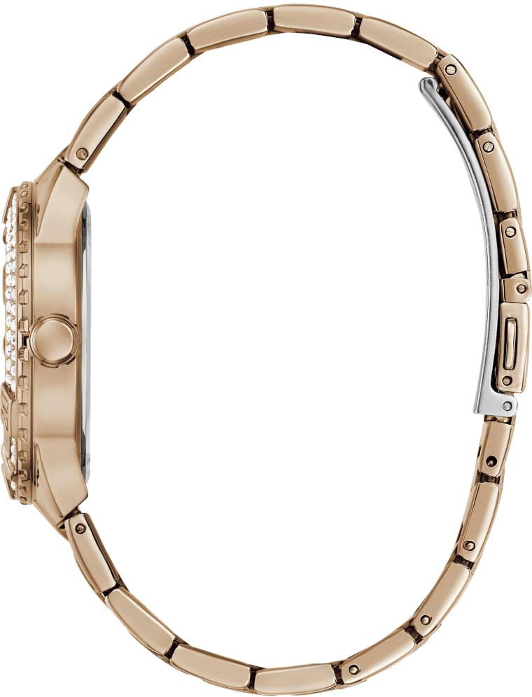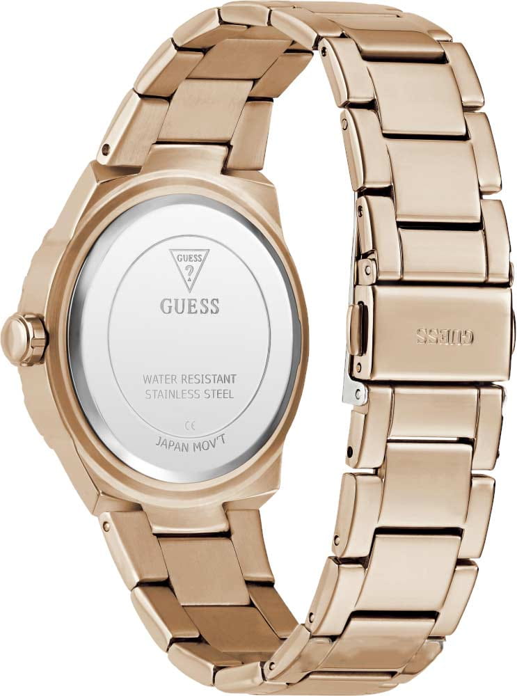 Элегантные женские наручные часы Guess GW0882L3 сочетают в себе стиль и функциональность. Эти часы оснащены точным кварцевым механизмом, что гарантирует надежность и долговечность. Корпус часов выполнен из прочной нержавеющей стали с IP-покрытиемIP-покрытиеМетод ионного напыления. Демонстрирует повышенную устойчивость к истиранию, окислению и химическим веществам. Под воздействием высокого давления и температуры около 1500°C молекулы металла надёжно соединяются с частицами корпуса часов. цвета розового золота, диаметром 36 мм, а безельБезельВнешний ободок, закрепляющий стекло. В спортивных часах так называется поворотное кольцо с делениями на циферблате, выполняет роль таймера – замеряет отрезки времени на шкале. Неподвижный безель – элемент декора. Однонаправленно вращающийся безель на дайверских часах позволяет фиксировать моменты погружения и выныривания на поверхность. украшен изысканными кристаллами, придающими им роскошный вид. Циферблат добавляет изделию утонченности и особого шарма. Часы оснащены стальным браслетом с IP-покрытиемIP-покрытиеМетод ионного напыления. Демонстрирует повышенную устойчивость к истиранию, окислению и химическим веществам. Под воздействием высокого давления и температуры около 1500°C молекулы металла надёжно соединяются с частицами корпуса часов. на раскладной застежкеРаскладная застёжкаТакой тип застёжки используется только на браслетах из металла. Она никогда не раскрывается полностью, происходит разделение на 2 и более частей. Раскладывающая застёжка снизит вероятность потери часов к минимуму., которая обеспечивает комфортное прилегание к запястью и надежную фиксацию. Люминесцентное покрытиеЛюминесцентное покрытиеПозволяет считывать показания времени в темноте. Производители наносят на стрелки, часовые индексы, безель или поверхность циферблата светонакопительный состав, дающий холодное свечение. на стрелках обеспечивает отличную видимость в темноте. Минеральное стеклоМинеральное стеклоМинеральное стекло представляет собой искусственно выращенный минерал кварца. Такое стекло отличается особой устойчивостью к повреждениям и царапинам. Уступает по некоторым качествам сапфировому стеклу. защищает циферблат от царапин и повреждений, сохраняя его безупречный вид. Водозащита 30WR гарантирует защиту от случайных брызг и дождя, что делает эти часы практичным аксессуаром для повседневной жизни. Рифленая заводная головка с защитой. Guess – это не просто аксессуар, это заявление о вашем безупречном вкусе и стремлении к совершенству.