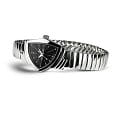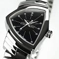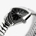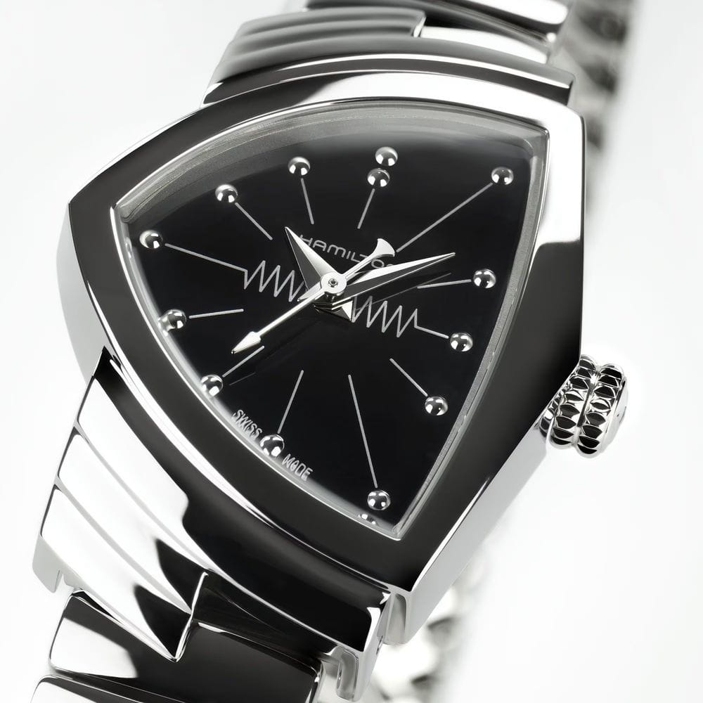 Hamilton Ventura S Quartz H24211130 — культовая модель в футуристическом дизайне, с которым история Hamilton связана уже более полувека. Корпус асимметричной формы размером 24 × 36 мм выполнен из нержавеющей стали с полированной поверхностью. Эффектный геометрический силуэт подчёркивает винтажный стиль середины XX века. Циферблат защищён минеральным стекломМинеральное стеклоМинеральное стекло представляет собой искусственно выращенный минерал кварца. Такое стекло отличается особой устойчивостью к повреждениям и царапинам. Уступает по некоторым качествам сапфировому стеклу., устойчивым к повседневным воздействиям. Чёрный циферблат оформлен лаконично, со стрелками и индексами серебристого цвета, создающими контраст и визуальную чёткость. Внутри установлен швейцарский кварцевый механизм ETA F03.105, обеспечивающий точность и надёжность. Модель комплектуется браслетом из нержавеющей стали с гибкой конструкцией и раскладной застёжкойРаскладная застёжкаТакой тип застёжки используется только на браслетах из металла. Она никогда не раскрывается полностью, происходит разделение на 2 и более частей. Раскладывающая застёжка снизит вероятность потери часов к минимуму., что обеспечивает комфортную посадку на запястье. Водонепроницаемость 50 метров делает Ventura подходящей для повседневной носки. Hamilton Ventura S Quartz — символ дерзкого дизайна и узнаваемого стиля для тех, кто ценит уникальность в деталях.