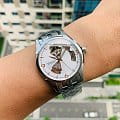 Мужские часы-скелетоны Hamilton Jazzmaster Open Heart Auto H32565155 с автоматическим механизмом Н-10. Корпус часов изготовлен из нержавеющей стали. Стрелки и метки с люминесцентным покрытиемЛюминесцентное покрытиеПозволяет считывать показания времени в темноте. Производители наносят на стрелки, часовые индексы, безель или поверхность циферблата светонакопительный состав, дающий холодное свечение.. Сапфировое стеклоСапфировое стеклоПрочный и надёжный материал из кристалла сапфира синтетического происхождения, характеризующийся особой твёрдостью и устойчивостью к царапинам и повреждениям. с антибликовым покрытием. Стальной браслет на застёжке-бабочке с кнопкамиЗастёжка "бабочка"Такой вид застёжки дополняется предохранителями, помогающими избежать случайного раскрытия браслета. Обладают изящным исполнением. . Уровень влагозащиты: 50 метров, позволит защитить корпус от случайных брызг или капель дождя.