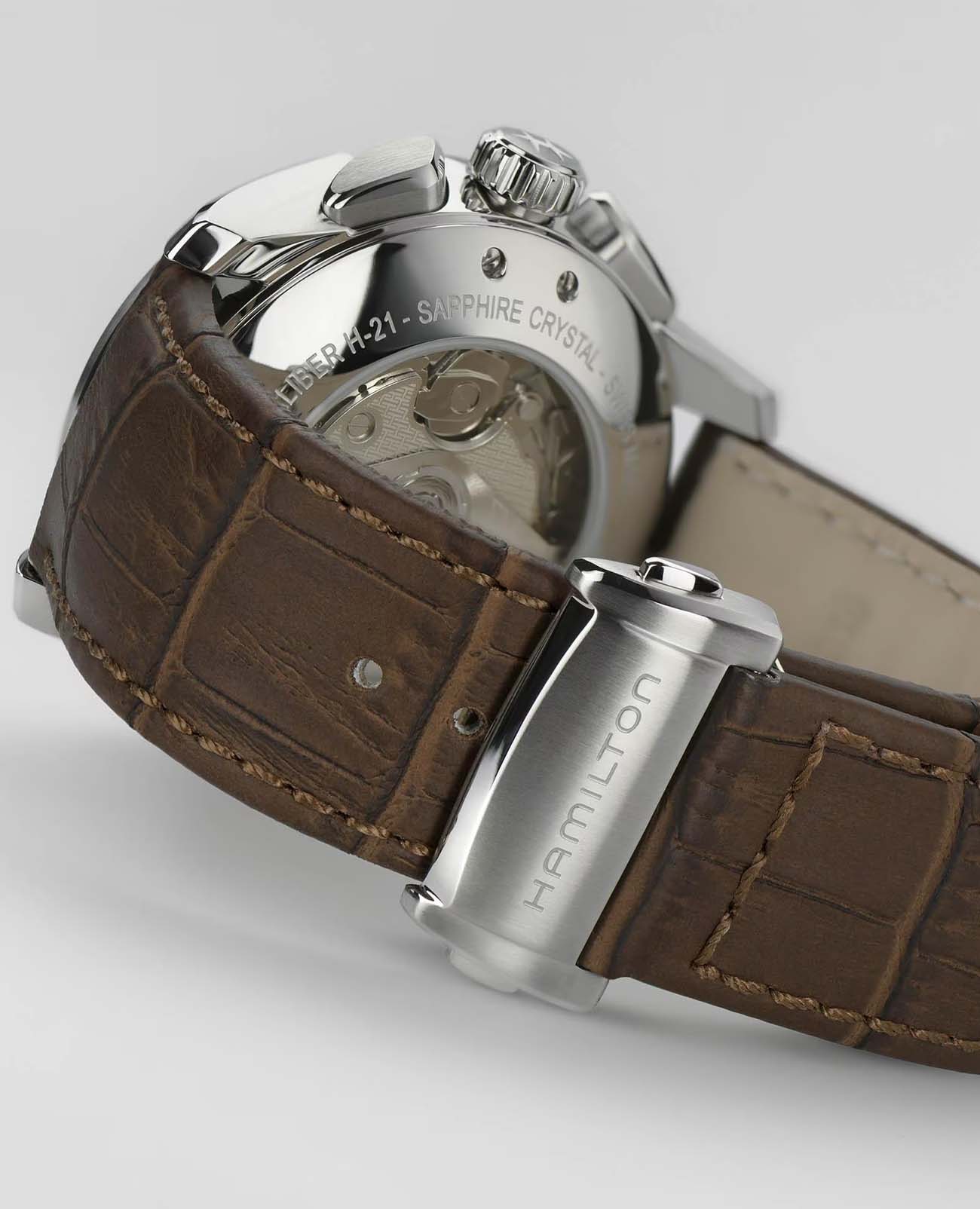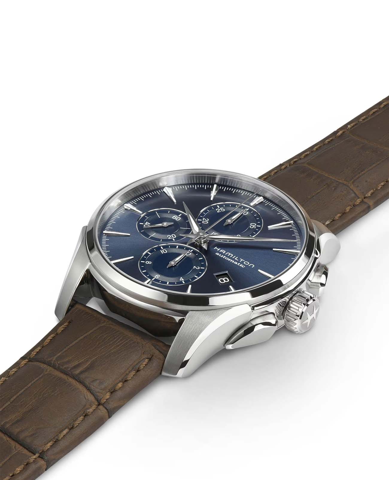 Часы-хронографХронографФункция позволяет измерять отрезки времени с особой точностью: часы, минуты, секунды. Верным признаком хронографа является наличие на циферблате 3 дополнительных окошек-счётчиков. Hamilton Jazzmaster Auto Chrono H32586541 с автоматическим механизмом высокой точности. Сапфировое стеклоСапфировое стеклоПрочный и надёжный материал из кристалла сапфира синтетического происхождения, характеризующийся особой твёрдостью и устойчивостью к царапинам и повреждениям. устойчивое к появлению царапин, обладающее высокой прозрачностью. Класс водозащиты: 100 метров, позволит плавать, нырять и заниматься другими водными видами спорта. Корпус часов изготовлен из нержавеющей стали. Практичный кожаный ремешок с раскладной застёжкойРаскладная застёжкаТакой тип застёжки используется только на браслетах из металла. Она никогда не раскрывается полностью, происходит разделение на 2 и более частей. Раскладывающая застёжка снизит вероятность потери часов к минимуму.. Стрелки и метки с люминесцентным покрытиемЛюминесцентное покрытиеПозволяет считывать показания времени в темноте. Производители наносят на стрелки, часовые индексы, безель или поверхность циферблата светонакопительный состав, дающий холодное свечение.. Окошко даты находится в положении 4 часа.