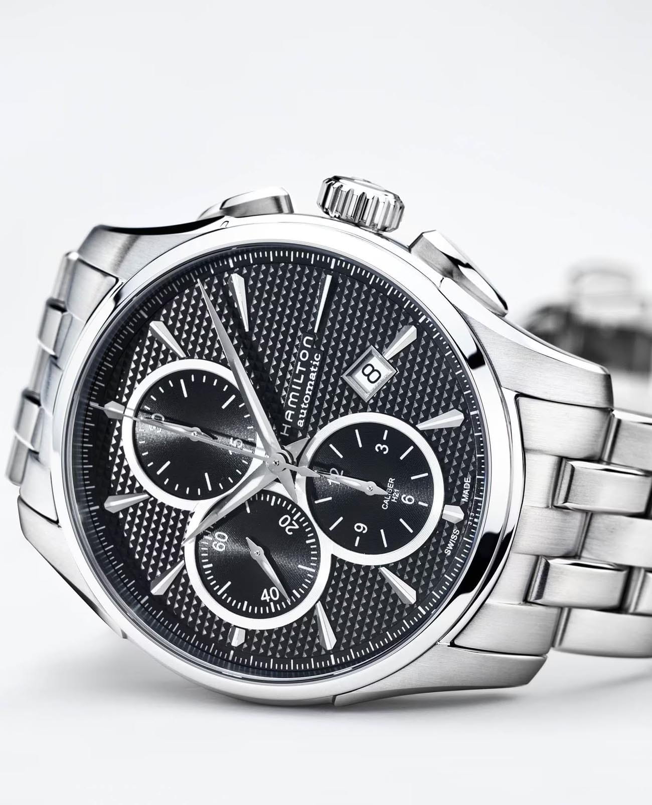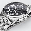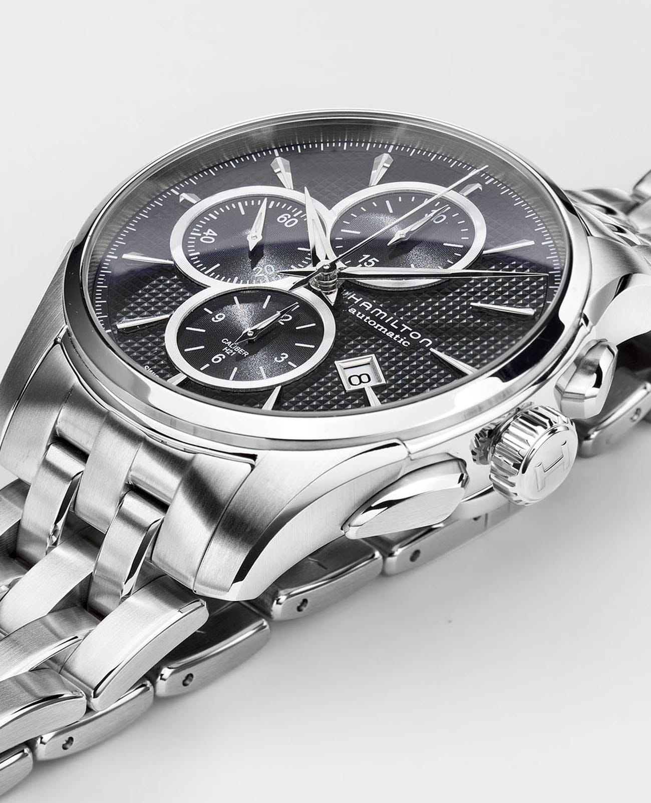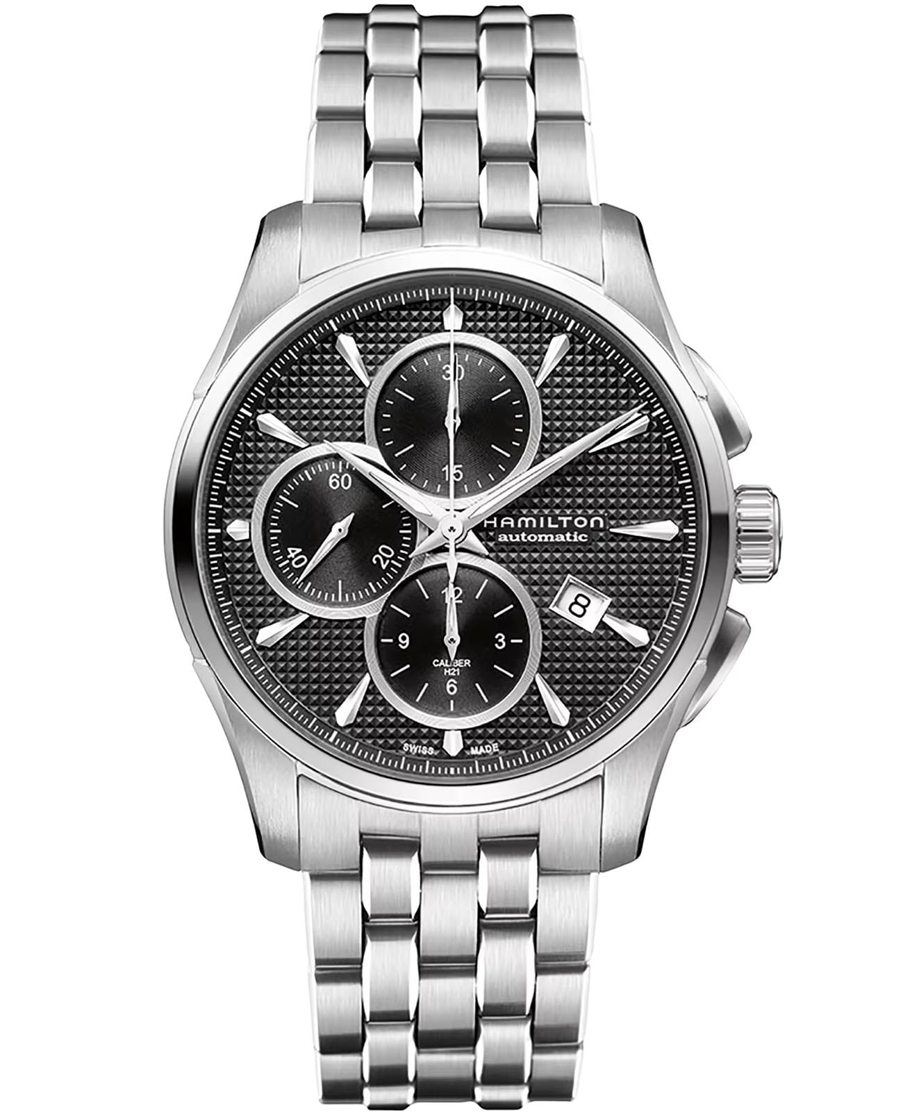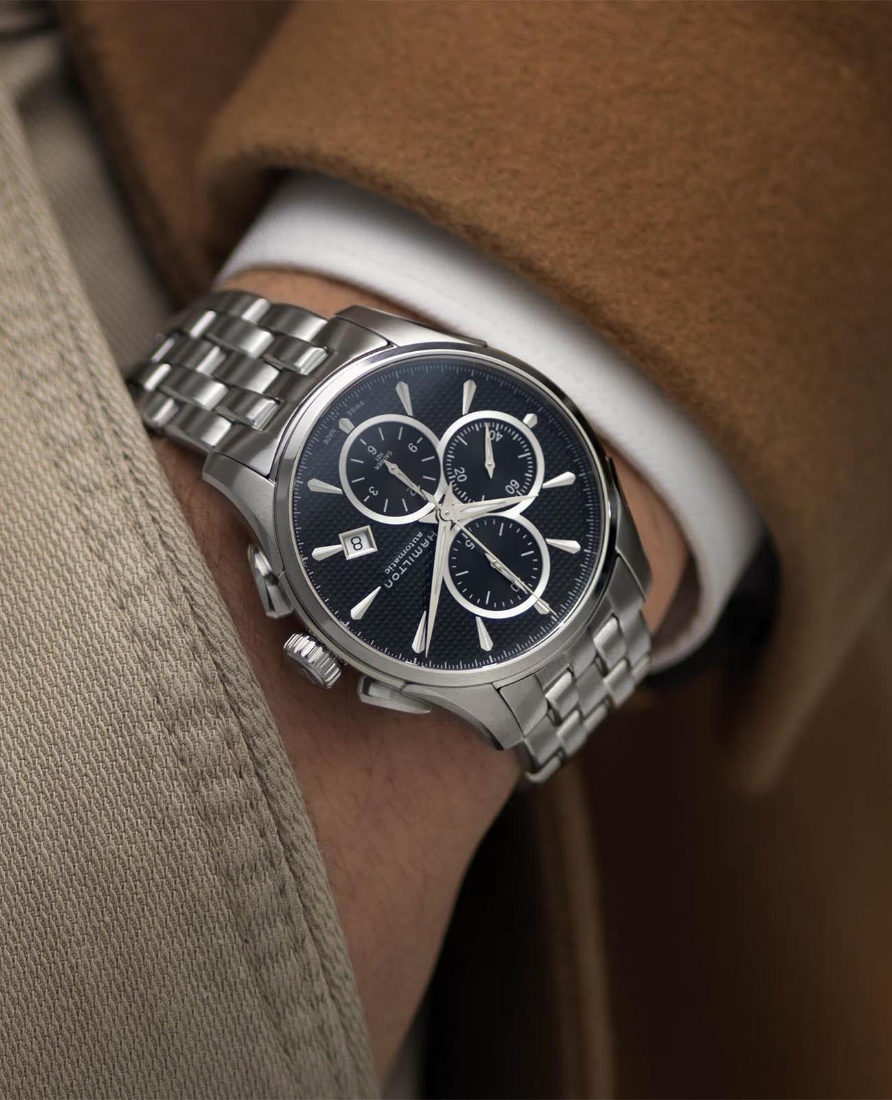 Часы-хронографХронографФункция позволяет измерять отрезки времени с особой точностью: часы, минуты, секунды. Верным признаком хронографа является наличие на циферблате 3 дополнительных окошек-счётчиков. Hamilton Jazzmaster Auto Chrono H32596131 с автоматическим механизмом высокой точности. Сапфировое стеклоСапфировое стеклоПрочный и надёжный материал из кристалла сапфира синтетического происхождения, характеризующийся особой твёрдостью и устойчивостью к царапинам и повреждениям. устойчивое к появлению царапин, обладающее высокой прозрачностью. Класс водозащиты: 100 метров, позволит плавать, нырять и заниматься другими водными видами спорта. Корпус и браслет часов изготовлены из нержавеющей стали. Стальной браслет на застёжке-бабочке с кнопкамиЗастёжка "бабочка"Такой вид застёжки дополняется предохранителями, помогающими избежать случайного раскрытия браслета. Обладают изящным исполнением. . Стрелки и метки с люминесцентным покрытиемЛюминесцентное покрытиеПозволяет считывать показания времени в темноте. Производители наносят на стрелки, часовые индексы, безель или поверхность циферблата светонакопительный состав, дающий холодное свечение.. Окошко даты находится в положении 4 часа.