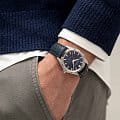 Модели из линии Jazzmaster Performer, привлекающие внимание ярким дизайном в стиле спортивный шик, сочетают в себе функциональность и эстетичность. Часы Jazzmaster Performer Automatic оснащены автоматическим механизмом H-10 с 80-часовым запасом хода. Модель в корпусе из нержавеющей стали диаметром 38 мм имеет лаконичный синий циферблат и сочетающийся с ним перфорированный синий кожаный ремешок в гоночном стиле.