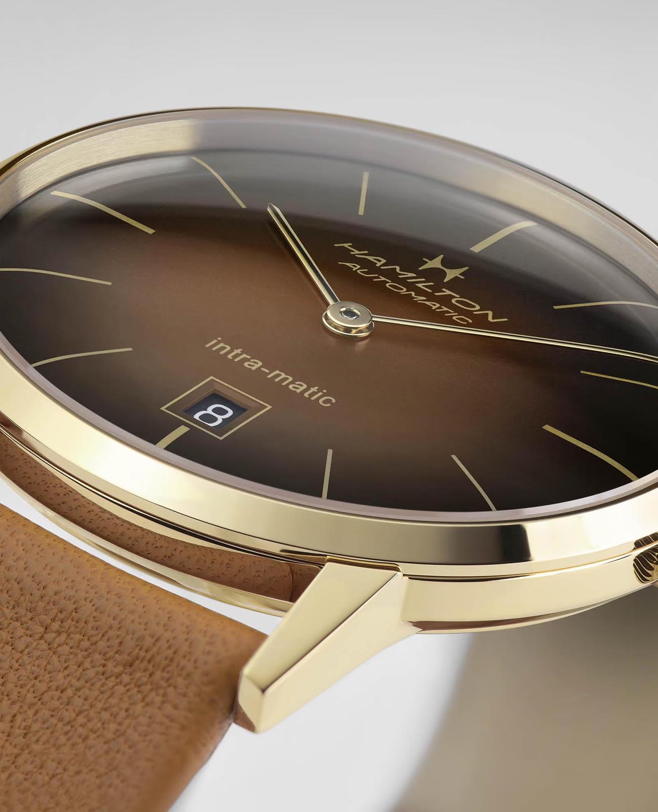 Мужские наручные часы Hamilton American Classic Intra-Matic Auto H38475501 с надёжным автоматическим механизмом. Корпус часов изготовлен из нержавеющей стали с золотым PVD-покрытиемPVDУльтратонкое покрытие наносится в технике вакуумного напыления, сочетает в себе нитрид титана особой прочности со слоем золота или оксида хрома. Несёт в себе декоративную или защитную функцию.. Практичный кожаный ремешок на стандартной застёжке. Сапфировое стеклоСапфировое стеклоПрочный и надёжный материал из кристалла сапфира синтетического происхождения, характеризующийся особой твёрдостью и устойчивостью к царапинам и повреждениям. с антибликовым покрытием. Окошко даты находится в положении 6 часов.