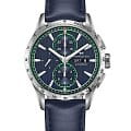 Мужские швейцарские наручные часы-хронографХронографФункция позволяет измерять отрезки времени с особой точностью: часы, минуты, секунды. Верным признаком хронографа является наличие на циферблате 3 дополнительных окошек-счётчиков. Hamilton Broadway Day Date Auto Chrono H43516641 с надёжным кварцевым механизмом. Корпус часов изготовлен из нержавеющей стали. Кожаный ремешок на стандартной застёжке. Сапфировое стеклоСапфировое стеклоПрочный и надёжный материал из кристалла сапфира синтетического происхождения, характеризующийся особой твёрдостью и устойчивостью к царапинам и повреждениям. устойчивое к мелким механическим повреждениям. Стрелки и метки с люминесцентным покрытиемЛюминесцентное покрытиеПозволяет считывать показания времени в темноте. Производители наносят на стрелки, часовые индексы, безель или поверхность циферблата светонакопительный состав, дающий холодное свечение.. Окошки дня недели и даты находятся в положении 3 часа. Класс водозащиты: 50 метров, позволит защитить корпус от случайных брызг или капель дождя. БезельБезельВнешний ободок, закрепляющий стекло. В спортивных часах так называется поворотное кольцо с делениями на циферблате, выполняет роль таймера – замеряет отрезки времени на шкале. Неподвижный безель – элемент декора. Однонаправленно вращающийся безель на дайверских часах позволяет фиксировать моменты погружения и выныривания на поверхность. со шкалой тахиметраТахиметрРазмеченная шкала, располагается на ободке или безеле часов. Тахиметр позволяет рассчитать скорость на определённом участке пути, расстояние измеряется в километрах или милях..