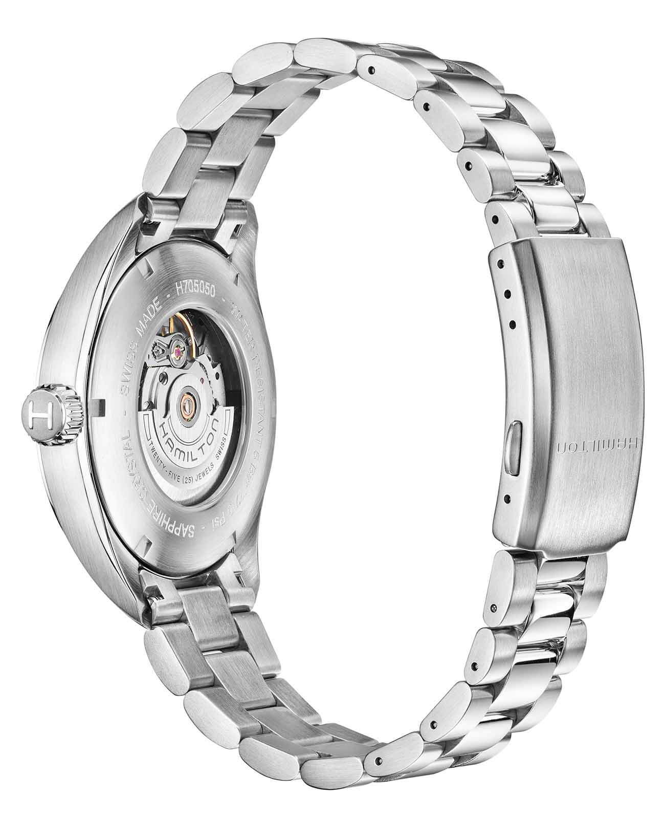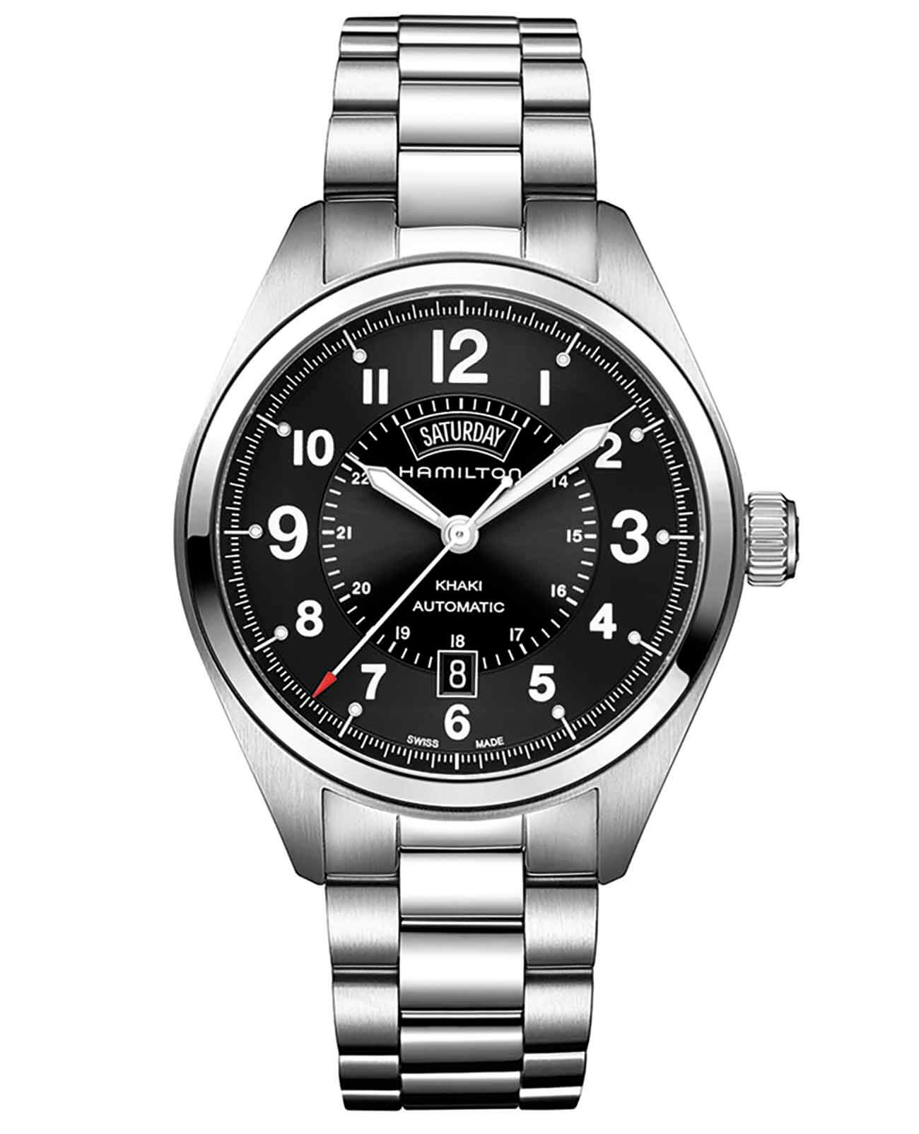 Мужские швейцарские механические часы Hamilton Khaki Field Day Date Auto H70505133, механический механизм (автоматический калибр) с высокой точностью. Сапфировое стекло устойчивое к появлению царапин, обладающее высокой прозрачностью. Класс водозащиты: 50 метров, позволит защитить корпус от случайных брызг или капель дождя. Корпус часов изготовлен из стали, серебристого цвета.