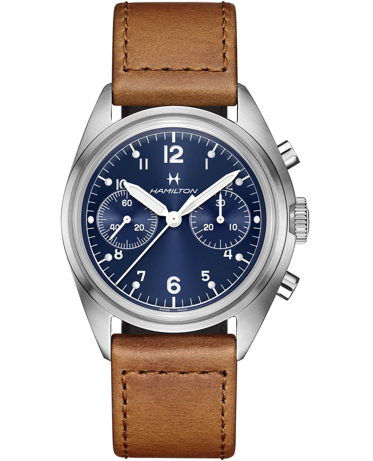 Мужские стильные швейцарские часы Hamilton Khaki Aviation Pilot Pioneer Mechanical Chronograph 40mm H76409540. Стальной корпус диаметром 40 мм и толщиной 14,35 мм подчеркивает брутальность модели, а сапфировое стеклоСапфировое стеклоПрочный и надёжный материал из кристалла сапфира синтетического происхождения, характеризующийся особой твёрдостью и устойчивостью к царапинам и повреждениям. с антибликовым покрытиемАнтибликовое покрытиеСлой оксида металла в 0,13-0,3 микрон, благодаря которому стекло часов не бликует и не отражает свет. Антибликовое покрытие уменьшает отражение света в 10 раз, обеспечивая отличную читаемость показателей циферблата. обеспечивает превосходную читаемость матового синего циферблата со стрелками с люминесцентным покрытиемЛюминесцентное покрытиеПозволяет считывать показания времени в темноте. Производители наносят на стрелки, часовые индексы, безель или поверхность циферблата светонакопительный состав, дающий холодное свечение. Super-LumiNova®. Модель оснащена функцией хронографаХронографФункция позволяет измерять отрезки времени с особой точностью: часы, минуты, секунды. Верным признаком хронографа является наличие на циферблате 3 дополнительных окошек-счётчиков.. Механизм с ручным заводом H-51 оснащен кремниевой спиралью, обеспечивающей запас хода 60 часов и устойчивость к магнитным полям.  Изысканный ремешок выполнен из кожи со стандартной застежкой, гарантирующей комфортное ношение и безопасность. Водонепроницаемость часов достигает 10 атмосфер (100 метров), делающая их подходящими для повседневного использования и активного отдыха. Это сочетание высокой прочности, точности и изысканного дизайна для уверенных в себе мужчин.