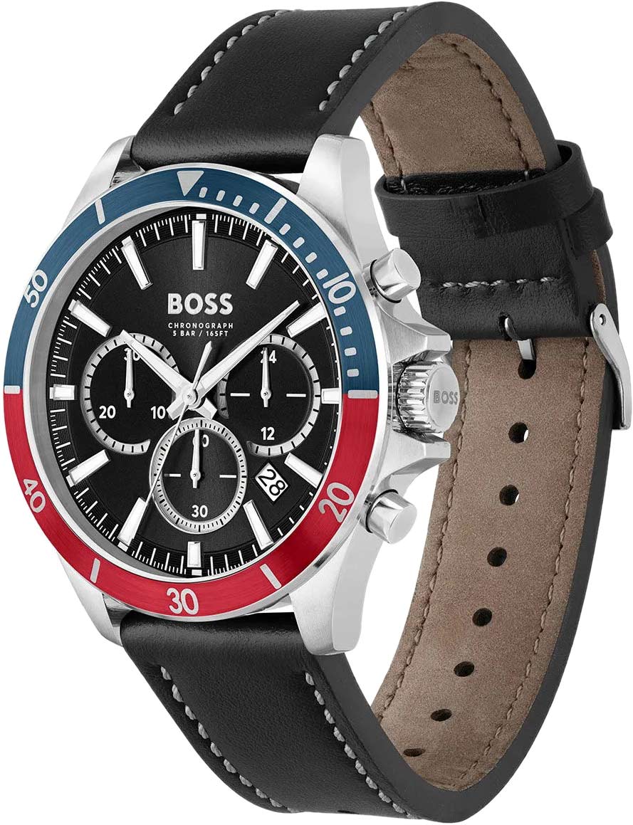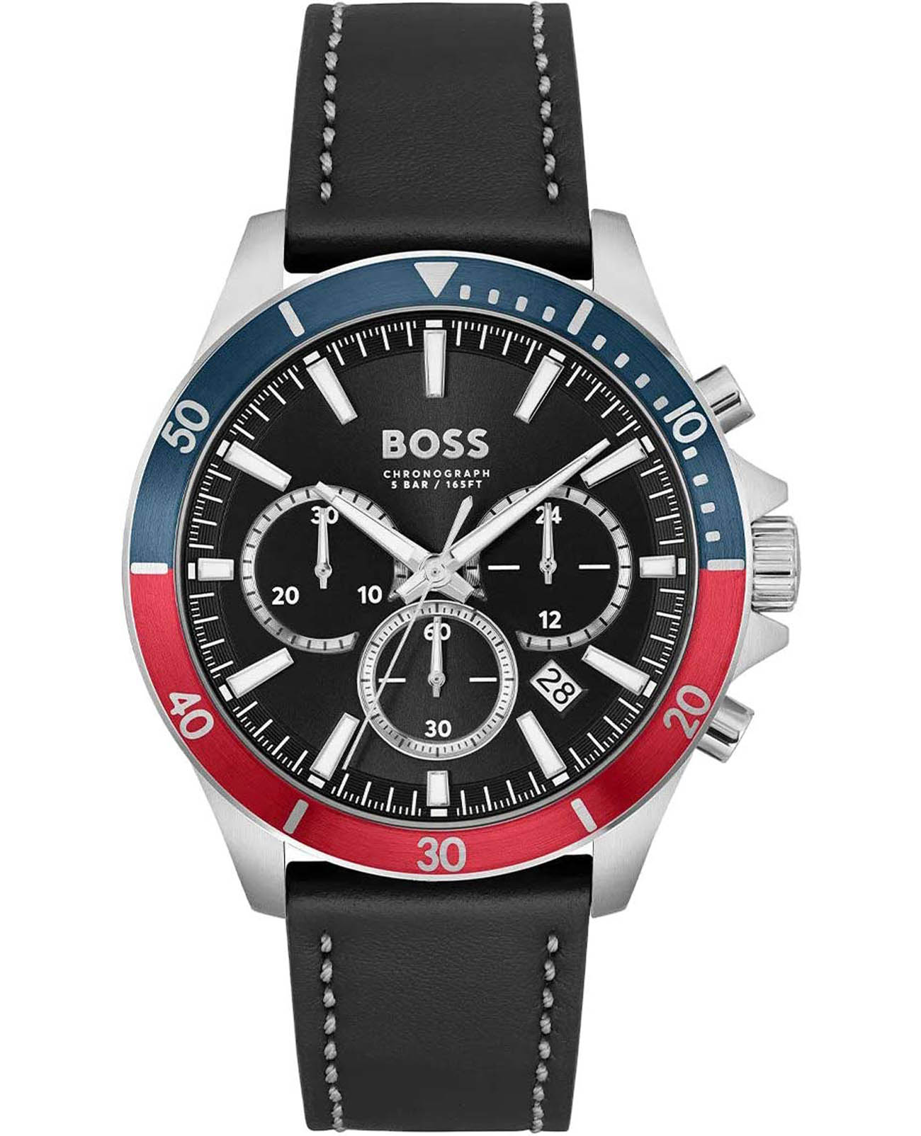 Мужские часы Hugo Boss Troper HB1514099 представлены в круглом 44-мм корпусе из нержавеющей стали с IP-покрытиемIP-покрытиеМетод ионного напыления. Демонстрирует повышенную устойчивость к истиранию, окислению и химическим веществам. Под воздействием высокого давления и температуры около 1500°C молекулы металла надёжно соединяются с частицами корпуса часов.. Оснащены кварцевым механизмом с функциями хронографаХронографФункция позволяет измерять отрезки времени с особой точностью: часы, минуты, секунды. Верным признаком хронографа является наличие на циферблате 3 дополнительных окошек-счётчиков. и секундомеромСекундомерСекундоме́р — прибор, способный измерять интервалы времени с точностью до долей секунды.. Черный циферблат защищен устойчивым к царапинам минеральным стекломМинеральное стеклоМинеральное стекло представляет собой искусственно выращенный минерал кварца. Такое стекло отличается особой устойчивостью к повреждениям и царапинам. Уступает по некоторым качествам сапфировому стеклу., а стрелки покрыты люминесцентным составомЛюминесцентное покрытиеПозволяет считывать показания времени в темноте. Производители наносят на стрелки, часовые индексы, безель или поверхность циферблата светонакопительный состав, дающий холодное свечение. для видимости в темноте. Браслет из кожи дополнен стандартной застежкой. Водонепроницаемость 50 метров (5 ATM) позволяет использовать часы для плавания.