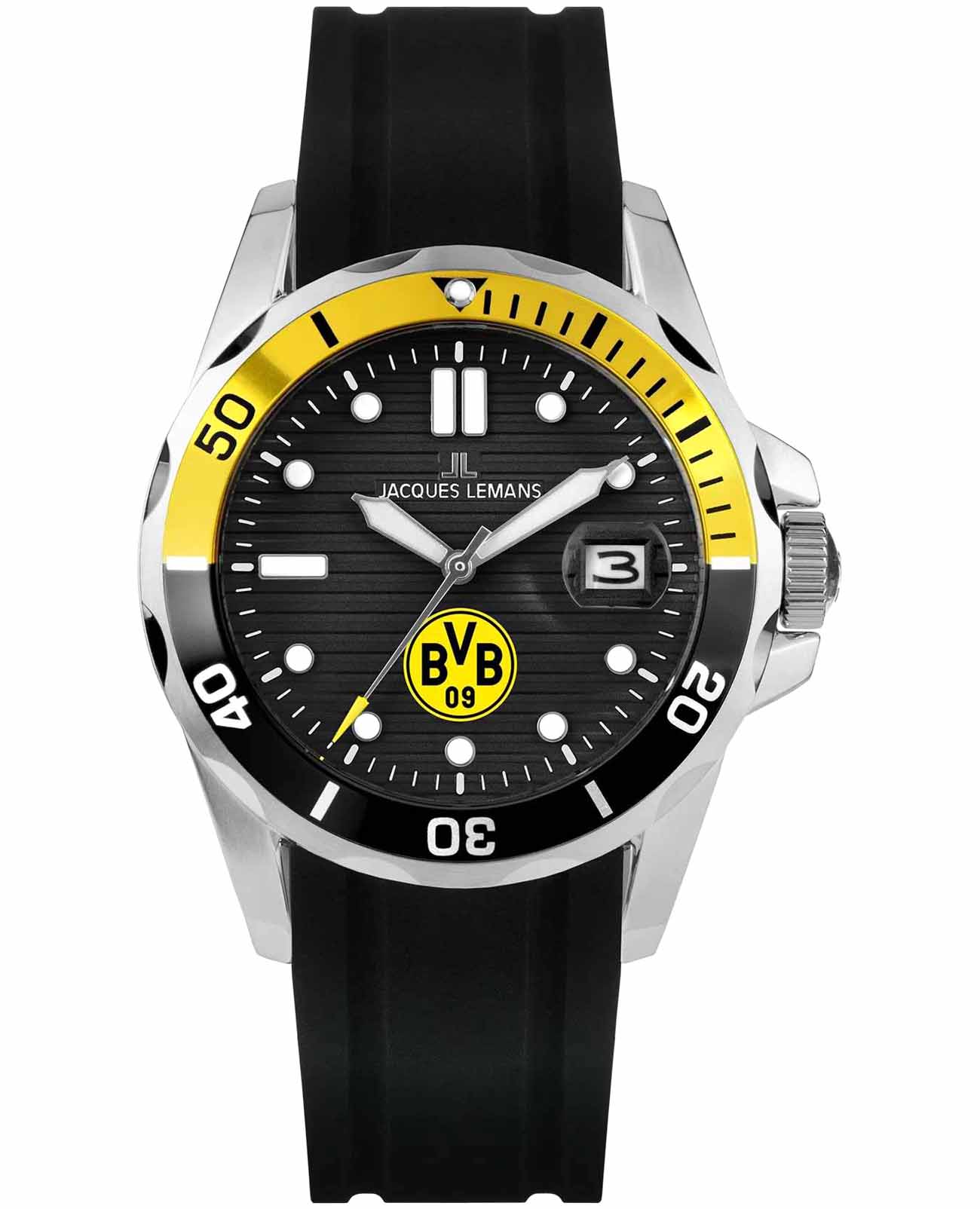 Мужские часы Jacques Lemans Borussia Dortmund BVB-07 — это стильное сочетание элегантности и современного дизайна. Корпус из нержавеющей стали диаметром 41 мм идеально сбалансирован и элегантен. Минеральное стеклоМинеральное стеклоМинеральное стекло представляет собой искусственно выращенный минерал кварца. Такое стекло отличается особой устойчивостью к повреждениям и царапинам. Уступает по некоторым качествам сапфировому стеклу. Crystex защищает циферблат от царапин. Удобный силиконовый ремешок с классической застежкой идеально дополняют дизайн часов, обеспечивая комфортное ношение. Стрелки и метки с люминесцентным покрытиемЛюминесцентное покрытиеПозволяет считывать показания времени в темноте. Производители наносят на стрелки, часовые индексы, безель или поверхность циферблата светонакопительный состав, дающий холодное свечение.. БезельБезельВнешний ободок, закрепляющий стекло. В спортивных часах так называется поворотное кольцо с делениями на циферблате, выполняет роль таймера – замеряет отрезки времени на шкале. Неподвижный безель – элемент декора. Однонаправленно вращающийся безель на дайверских часах позволяет фиксировать моменты погружения и выныривания на поверхность. с PVDPVDУльтратонкое покрытие наносится в технике вакуумного напыления, сочетает в себе нитрид титана особой прочности со слоем золота или оксида хрома. Несёт в себе декоративную или защитную функцию. покрытием обрамляет циферблат. Часы обладают впечатляющей водонепроницаемостью до 10 бар (100 метров), что делает их идеальными для повседневной носки. Окошко даты с увеличительным стеклом находится в положении 3 часа. Рифленая заводная головка с защитой. Циферблат украшает логотип клуба «Боруссия», одного из самых знаковых футбольных клубов в мире.