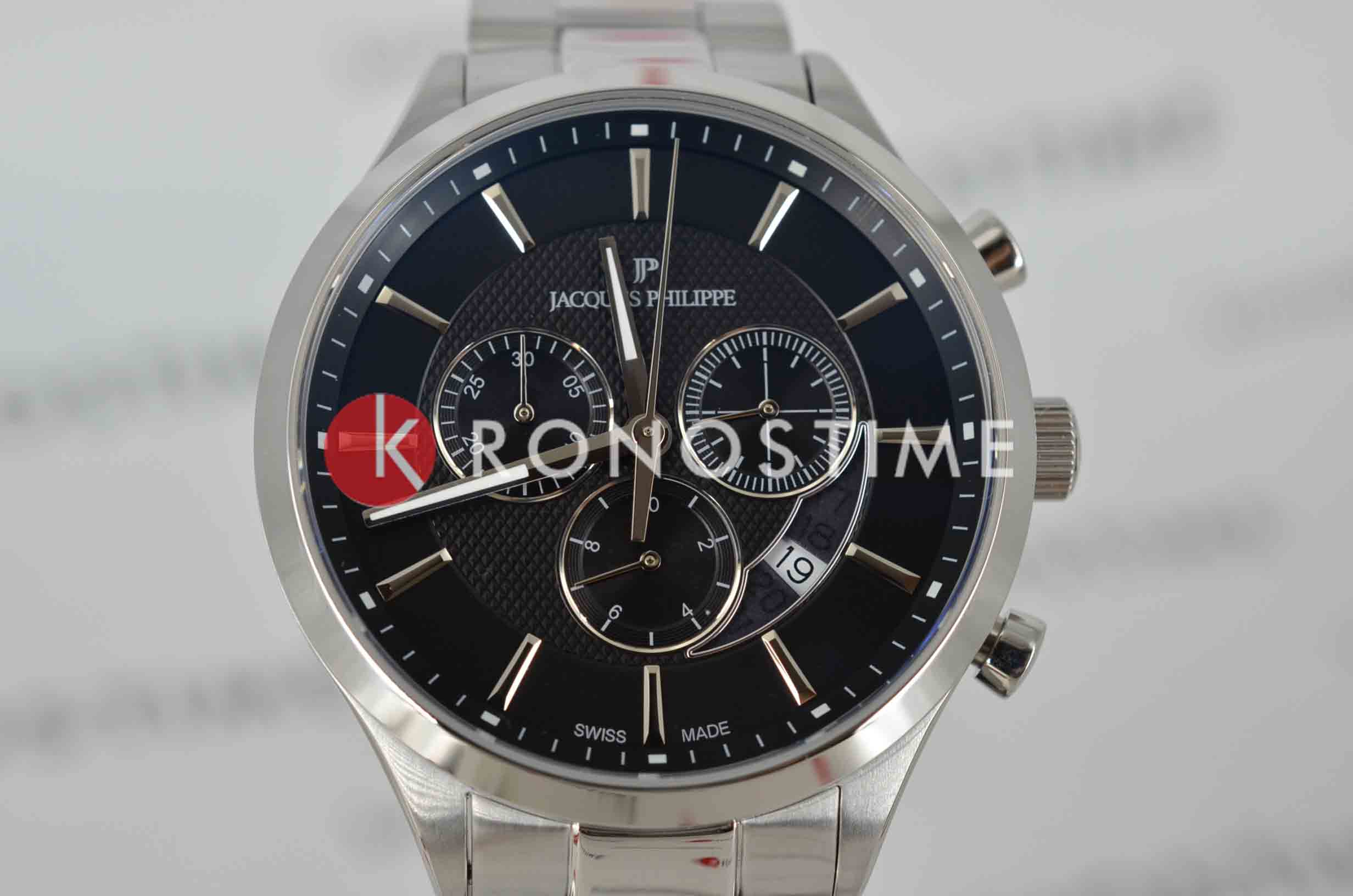 Швейцарские мужские часы-хронографХронографФункция позволяет измерять отрезки времени с особой точностью: часы, минуты, секунды. Верным признаком хронографа является наличие на циферблате 3 дополнительных окошек-счётчиков. Jacques Philippe Gallant JPQGC031316N, кварцевый механизм с высокой точностью. Сапфировое стеклоСапфировое стеклоПрочный и надёжный материал из кристалла сапфира синтетического происхождения, характеризующийся особой твёрдостью и устойчивостью к царапинам и повреждениям. устойчивое к появлению царапин, обладающее высокой прозрачностью. Корпус часов изготовлен из нержавеющей стали. На циферблате три дополнительных индикатора. Стрелки с люминесцентным покрытиемЛюминесцентное покрытиеПозволяет считывать показания времени в темноте. Производители наносят на стрелки, часовые индексы, безель или поверхность циферблата светонакопительный состав, дающий холодное свечение.. Окошко даты находится между 4 и 5 часами. Класс водозащиты: 50 метров, позволит защитить корпус от случайных брызг или капель дождя. Стальной браслет на застёжке «бабочка» с кнопкамиЗастёжка "бабочка"Такой вид застёжки дополняется предохранителями, помогающими избежать случайного раскрытия браслета. Обладают изящным исполнением. .