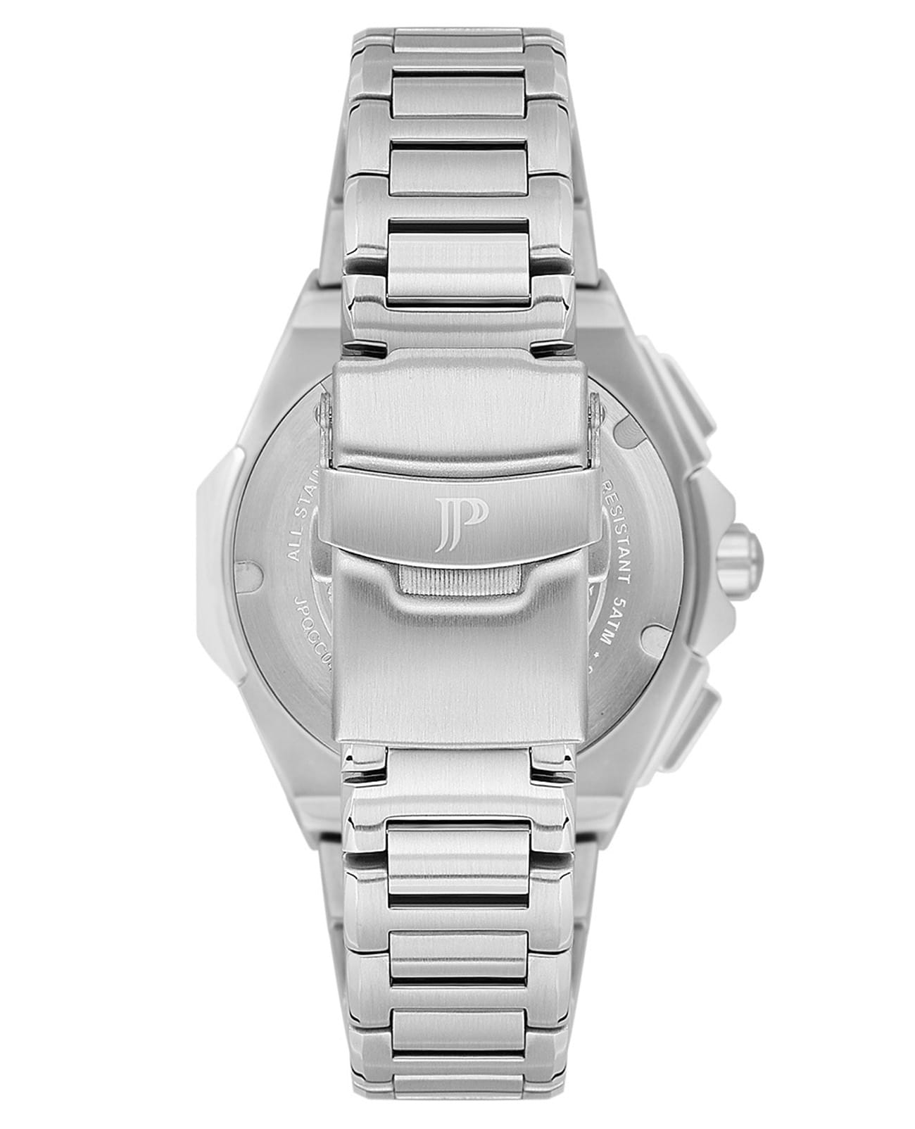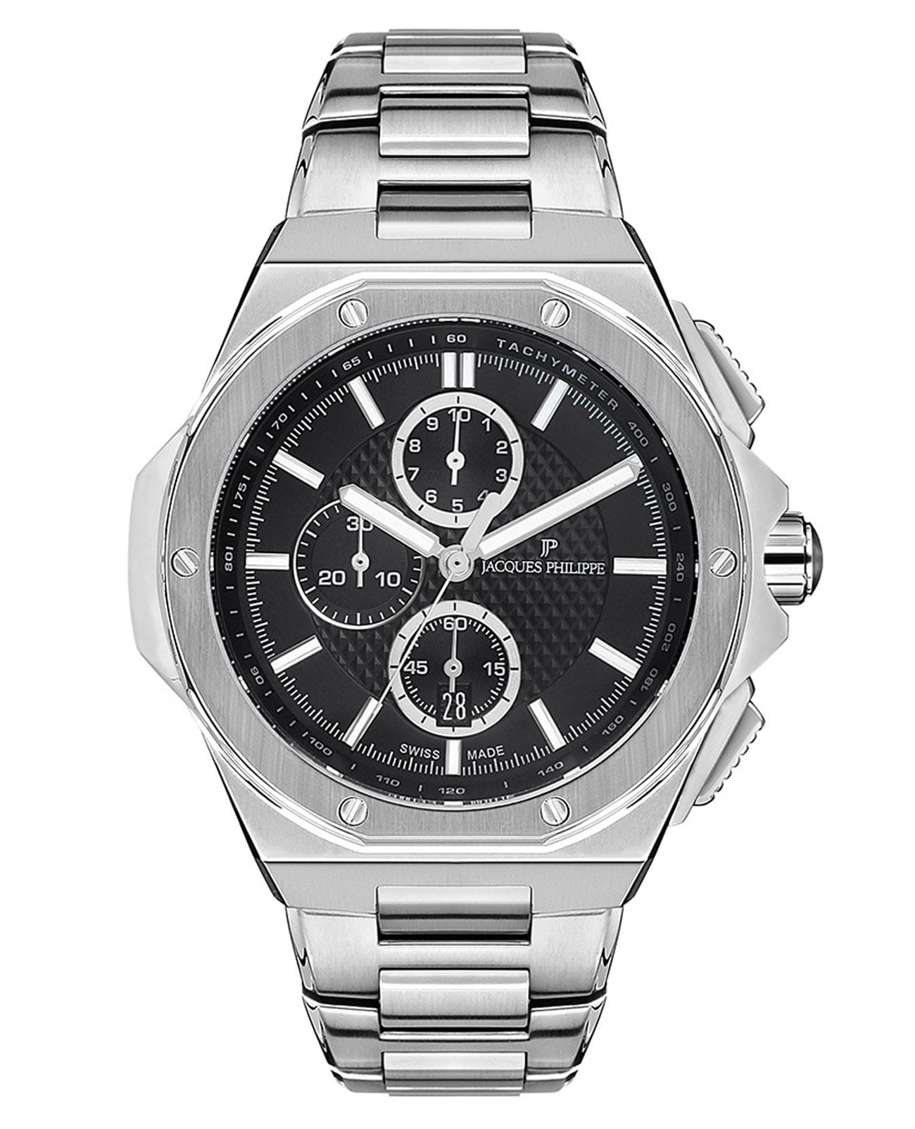 Швейцарские мужские часы-хронографХронографФункция позволяет измерять отрезки времени с особой точностью: часы, минуты, секунды. Верным признаком хронографа является наличие на циферблате 3 дополнительных окошек-счётчиков. с секундомеромСекундомерСекундоме́р — прибор, способный измерять интервалы времени с точностью до долей секунды. Jacques Philippe Esquire JPQGC041316, кварцевый механизм с высокой точностью. Сапфировое стеклоСапфировое стеклоПрочный и надёжный материал из кристалла сапфира синтетического происхождения, характеризующийся особой твёрдостью и устойчивостью к царапинам и повреждениям. устойчивое к появлению царапин, обладающее высокой прозрачностью. Корпус часов изготовлен из нержавеющей стали. На циферблате три дополнительных индикатора. Стрелки с люминесцентным покрытиемЛюминесцентное покрытиеПозволяет считывать показания времени в темноте. Производители наносят на стрелки, часовые индексы, безель или поверхность циферблата светонакопительный состав, дающий холодное свечение.. Шкала тахиметраТахиметрРазмеченная шкала, располагается на ободке или безеле часов. Тахиметр позволяет рассчитать скорость на определённом участке пути, расстояние измеряется в километрах или милях. на циферблате. Класс водозащиты: 50 метров, позволит защитить корпус от случайных брызг или капель дождя. Стальной браслет на раскладной застёжкеРаскладная застёжкаТакой тип застёжки используется только на браслетах из металла. Она никогда не раскрывается полностью, происходит разделение на 2 и более частей. Раскладывающая застёжка снизит вероятность потери часов к минимуму..
