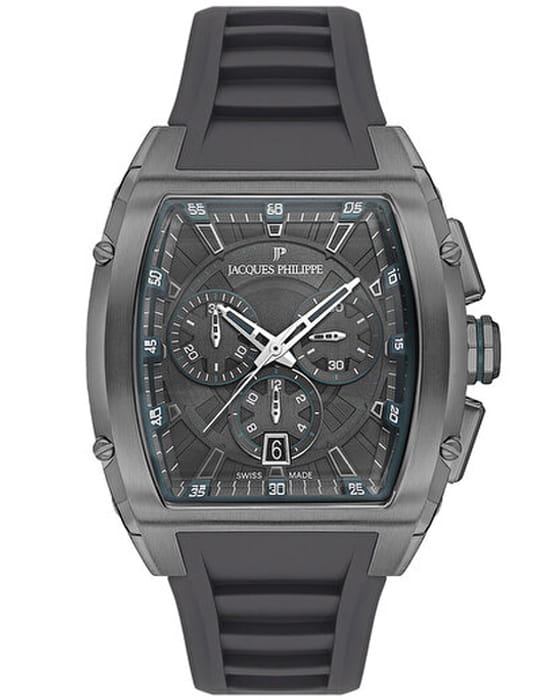 Швейцарские мужские часы-хронографХронографФункция позволяет измерять отрезки времени с особой точностью: часы, минуты, секунды. Верным признаком хронографа является наличие на циферблате 3 дополнительных окошек-счётчиков. с секундомеромСекундомерСекундоме́р — прибор, способный измерять интервалы времени с точностью до долей секунды. Jacques Philippe Quadro JPQGC468447, кварцевый механизм с высокой точностью. Сапфировое стеклоСапфировое стеклоПрочный и надёжный материал из кристалла сапфира синтетического происхождения, характеризующийся особой твёрдостью и устойчивостью к царапинам и повреждениям. устойчивое к появлению царапин, обладающее высокой прозрачностью. Корпус часов изготовлен из нержавеющей стали. На циферблате три дополнительных индикатора. Окошко даты находится в положении 6 часов. Стрелки с люминесцентным покрытиемЛюминесцентное покрытиеПозволяет считывать показания времени в темноте. Производители наносят на стрелки, часовые индексы, безель или поверхность циферблата светонакопительный состав, дающий холодное свечение.. Класс водозащиты: 50 метров, позволит защитить корпус от случайных брызг или капель дождя. Силиконовый ремешок.