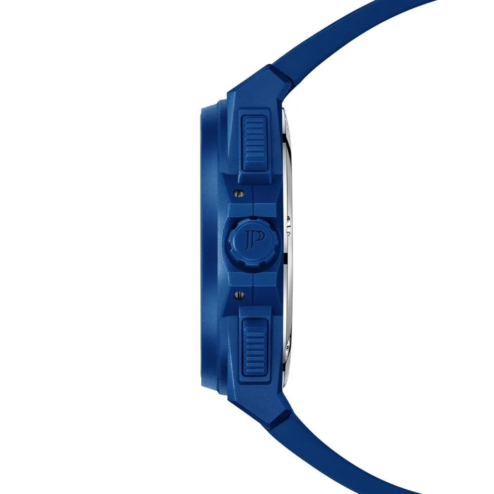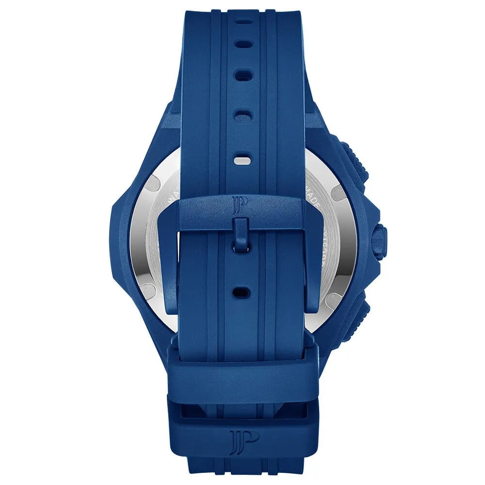 Часы Jacques Philippe JPQGC515432 из коллекции Militia — стильные швейцарские часы с функцией хронографаХронографФункция позволяет измерять отрезки времени с особой точностью: часы, минуты, секунды. Верным признаком хронографа является наличие на циферблате 3 дополнительных окошек-счётчиков. и секундомераСекундомерСекундоме́р — прибор, способный измерять интервалы времени с точностью до долей секунды., которые сочетают в себе элегантность и современный функционал. Модель оснащена надежным кварцевым механизмом, обеспечивающим высокую точность хода. Корпус выполнен из нержавеющей стали 316L с износостойким синим IP-покрытиемIP-покрытиеМетод ионного напыления. Демонстрирует повышенную устойчивость к истиранию, окислению и химическим веществам. Под воздействием высокого давления и температуры около 1500°C молекулы металла надёжно соединяются с частицами корпуса часов., диаметр корпуса составляет 48 мм, толщина — 12,5 мм. Сапфировое стеклоСапфировое стеклоПрочный и надёжный материал из кристалла сапфира синтетического происхождения, характеризующийся особой твёрдостью и устойчивостью к царапинам и повреждениям. защищает часы от царапин и сохраняет прозрачность даже при активном использовании. Синий циферблат дополнен тремя дополнительными индикаторами и окошком даты в положении 4 часа, а стрелки имеют люминесцентное покрытиеЛюминесцентное покрытиеПозволяет считывать показания времени в темноте. Производители наносят на стрелки, часовые индексы, безель или поверхность циферблата светонакопительный состав, дающий холодное свечение. для удобства чтения времени в темноте. Силиконовый браслет шириной 26 мм и длиной 19 см надежно фиксируется на запястье стандартной застежкой и обеспечивает комфорт при носке. Водозащита 5 АТМ позволяет не снимать часы при мытье рук или прогулках под дождём.