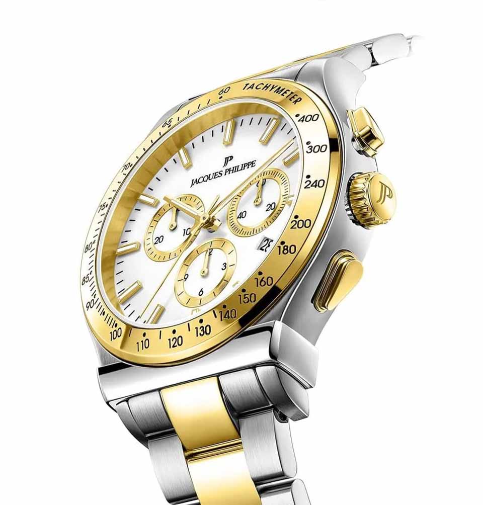 Jacques Philippe JPQGC707328 — швейцарские наручные часы, которые станут идеальным дополнением к образу современного мужчины, ценящего стиль и качество, это стильные швейцарские часы с функцией хронографаХронографФункция позволяет измерять отрезки времени с особой точностью: часы, минуты, секунды. Верным признаком хронографа является наличие на циферблате 3 дополнительных окошек-счётчиков. и секундомераСекундомерСекундоме́р — прибор, способный измерять интервалы времени с точностью до долей секунды.. Корпус и браслет выполнены из высокопрочной нержавеющей стали 316L, что подчеркивает статус владельца и гарантирует долговечность аксессуара. Классический дизайн с белым циферблатом гармонично сочетается с современными деталями: тахиметрическаяТахиметрРазмеченная шкала, располагается на ободке или безеле часов. Тахиметр позволяет рассчитать скорость на определённом участке пути, расстояние измеряется в километрах или милях. шкала на безелеБезельВнешний ободок, закрепляющий стекло. В спортивных часах так называется поворотное кольцо с делениями на циферблате, выполняет роль таймера – замеряет отрезки времени на шкале. Неподвижный безель – элемент декора. Однонаправленно вращающийся безель на дайверских часах позволяет фиксировать моменты погружения и выныривания на поверхность. с золотистым IP-покрытиемIP-покрытиеМетод ионного напыления. Демонстрирует повышенную устойчивость к истиранию, окислению и химическим веществам. Под воздействием высокого давления и температуры около 1500°C молекулы металла надёжно соединяются с частицами корпуса часов. добавляет функциональности, а окошко даты, расположенное на отметке «4 часа», обеспечивает дополнительное удобство. Сапфировое стеклоСапфировое стеклоПрочный и надёжный материал из кристалла сапфира синтетического происхождения, характеризующийся особой твёрдостью и устойчивостью к царапинам и повреждениям. надежно защищает часы от царапин и повреждений, сохраняя их безупречный внешний вид. Кварцевый механизм обеспечивает точный ход и не требует частого обслуживания. Водозащита до 10 атмосфер (100 метров) позволяет не снимать часы во время плавания. Стрелки имеют люминесцентное покрытиеЛюминесцентное покрытиеПозволяет считывать показания времени в темноте. Производители наносят на стрелки, часовые индексы, безель или поверхность циферблата светонакопительный состав, дающий холодное свечение. для удобства чтения времени в темноте. Стальной браслет с частичным золотистым IP-покрытиемIP-покрытиеМетод ионного напыления. Демонстрирует повышенную устойчивость к истиранию, окислению и химическим веществам. Под воздействием высокого давления и температуры около 1500°C молекулы металла надёжно соединяются с частицами корпуса часов. шириной 20 мм оснащен застежкой «бабочка»Застёжка "бабочка"Такой вид застёжки дополняется предохранителями, помогающими избежать случайного раскрытия браслета. Обладают изящным исполнением. для комфортного ношения в течение всего дня.