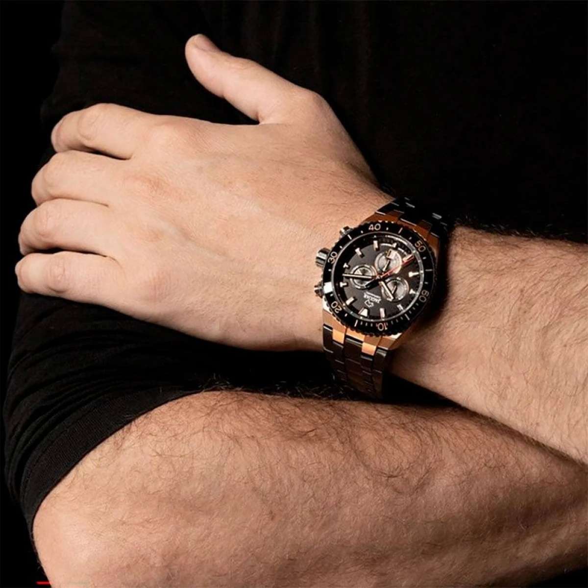 Мужские швейцарские часы Jaguar Ceramic J1023/1 — это стильное сочетание элегантности и современного дизайна. Корпус из нержавеющей стали с PVD-покрытиемPVDУльтратонкое покрытие наносится в технике вакуумного напыления, сочетает в себе нитрид титана особой прочности со слоем золота или оксида хрома. Несёт в себе декоративную или защитную функцию. диаметром 45 мм идеально сбалансирован и элегантен. Сапфировое стеклоСапфировое стеклоПрочный и надёжный материал из кристалла сапфира синтетического происхождения, характеризующийся особой твёрдостью и устойчивостью к царапинам и повреждениям. с антибликовым покрытием защищает циферблат от царапин и обеспечивает отличную читаемость при любом освещении. Стальной браслет на раскладной застёжкеРаскладная застёжкаТакой тип застёжки используется только на браслетах из металла. Она никогда не раскрывается полностью, происходит разделение на 2 и более частей. Раскладывающая застёжка снизит вероятность потери часов к минимуму. идеально дополняют дизайн часов, обеспечивая комфортное ношение. Стрелки и метки на циферблате имеют люминесцентное покрытиеЛюминесцентное покрытиеПозволяет считывать показания времени в темноте. Производители наносят на стрелки, часовые индексы, безель или поверхность циферблата светонакопительный состав, дающий холодное свечение. позволяющее легко определять время даже в темноте. Поворотный безельБезельВнешний ободок, закрепляющий стекло. В спортивных часах так называется поворотное кольцо с делениями на циферблате, выполняет роль таймера – замеряет отрезки времени на шкале. Неподвижный безель – элемент декора. Однонаправленно вращающийся безель на дайверских часах позволяет фиксировать моменты погружения и выныривания на поверхность. из нержавеющей стали и керамики. Часы обладают впечатляющей водонепроницаемостью до 10 бар (100 метров), что делает их идеальными для плавания, ныряния и погружений с аквалангом. В часах есть функция хронографаХронографФункция позволяет измерять отрезки времени с особой точностью: часы, минуты, секунды. Верным признаком хронографа является наличие на циферблате 3 дополнительных окошек-счётчиков., с помощью которой вы сможете измерять время с высокой точностью.