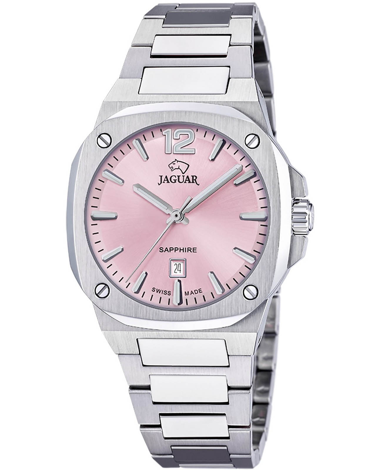 Женские швейцарские часы Jaguar Rond Carre J1027/3. Кварцевый швейцарский калибр Ronda 785. Сапфировое стеклоСапфировое стеклоПрочный и надёжный материал из кристалла сапфира синтетического происхождения, характеризующийся особой твёрдостью и устойчивостью к царапинам и повреждениям. устойчивое к мелким механическим повреждениям. Корпус и браслет часов изготовлены из нержавеющей стали. Стрелки и метки с люминесцентным покрытиемЛюминесцентное покрытиеПозволяет считывать показания времени в темноте. Производители наносят на стрелки, часовые индексы, безель или поверхность циферблата светонакопительный состав, дающий холодное свечение.. Окошко даты находится в положении 6 часов. Класс водозащиты: 100 метров, позволит плавать, нырять и заниматься другими водными видами спорта. Стальной браслет на раскладной застёжкеРаскладная застёжкаТакой тип застёжки используется только на браслетах из металла. Она никогда не раскрывается полностью, происходит разделение на 2 и более частей. Раскладывающая застёжка снизит вероятность потери часов к минимуму..