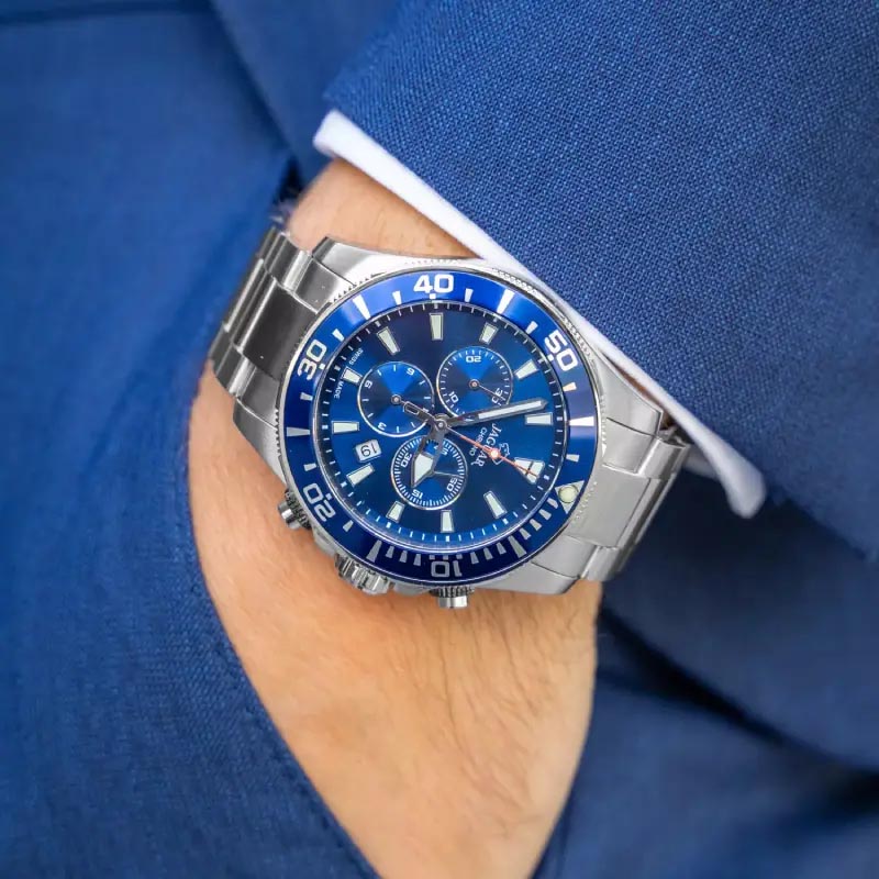 Мужские швейцарские часы-хронографХронографФункция позволяет измерять отрезки времени с особой точностью: часы, минуты, секунды. Верным признаком хронографа является наличие на циферблате 3 дополнительных окошек-счётчиков. Jaguar Executive Diver Chrono J861/2. Кварцевый швейцарский калибр Ronda 6003D. Сапфировое стеклоСапфировое стеклоПрочный и надёжный материал из кристалла сапфира синтетического происхождения, характеризующийся особой твёрдостью и устойчивостью к царапинам и повреждениям. устойчивое к мелким механическим повреждениям. Корпус и браслет часов изготовлены из нержавеющей стали. Стрелки и метки с люминесцентным покрытиемЛюминесцентное покрытиеПозволяет считывать показания времени в темноте. Производители наносят на стрелки, часовые индексы, безель или поверхность циферблата светонакопительный состав, дающий холодное свечение.. Окошко даты находится в положении между «4» и «5 часами». Класс водозащиты: 200 метров, позволит плавать, нырять и заниматься другими водными видами спорта. Стальной браслет на раскладной застёжкеРаскладная застёжкаТакой тип застёжки используется только на браслетах из металла. Она никогда не раскрывается полностью, происходит разделение на 2 и более частей. Раскладывающая застёжка снизит вероятность потери часов к минимуму.. БезельБезельВнешний ободок, закрепляющий стекло. В спортивных часах так называется поворотное кольцо с делениями на циферблате, выполняет роль таймера – замеряет отрезки времени на шкале. Неподвижный безель – элемент декора. Однонаправленно вращающийся безель на дайверских часах позволяет фиксировать моменты погружения и выныривания на поверхность. с PVD-покрытиемPVDУльтратонкое покрытие наносится в технике вакуумного напыления, сочетает в себе нитрид титана особой прочности со слоем золота или оксида хрома. Несёт в себе декоративную или защитную функцию..