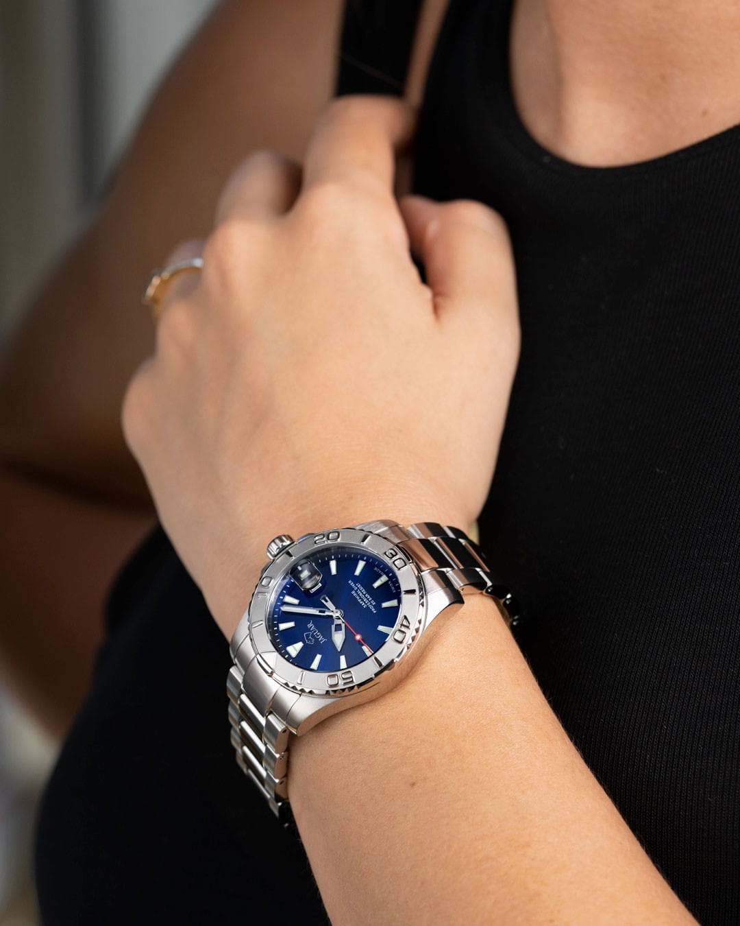 Унисекс швейцарские часы Jaguar Couple Diver J969/2. Кварцевый швейцарский калибр Ronda 6003.d. Сапфировое стеклоСапфировое стеклоПрочный и надёжный материал из кристалла сапфира синтетического происхождения, характеризующийся особой твёрдостью и устойчивостью к царапинам и повреждениям. устойчивое к мелким механическим повреждениям. Корпус и браслет часов изготовлены из нержавеющей стали. Стрелки и метки с люминесцентным покрытиемЛюминесцентное покрытиеПозволяет считывать показания времени в темноте. Производители наносят на стрелки, часовые индексы, безель или поверхность циферблата светонакопительный состав, дающий холодное свечение.. Окошко даты находится в положении 3 часа. Класс водозащиты: 200 метров, позволит плавать, нырять и заниматься другими водными видами спорта. Стальной браслет на раскладной застёжкеРаскладная застёжкаТакой тип застёжки используется только на браслетах из металла. Она никогда не раскрывается полностью, происходит разделение на 2 и более частей. Раскладывающая застёжка снизит вероятность потери часов к минимуму..