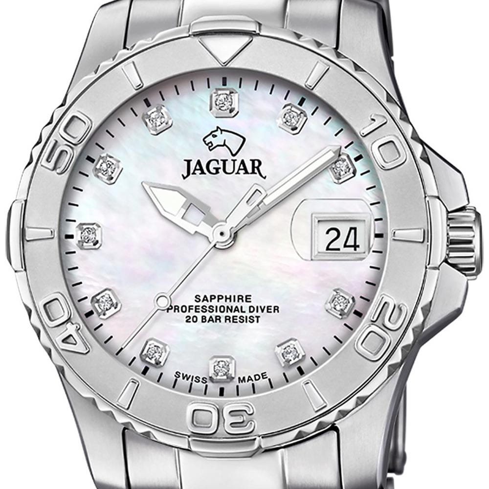 Женские швейцарские часы Jaguar Couple Diver J969/5. Кварцевый швейцарский калибр Ronda 6003.d. Сапфировое стеклоСапфировое стеклоПрочный и надёжный материал из кристалла сапфира синтетического происхождения, характеризующийся особой твёрдостью и устойчивостью к царапинам и повреждениям. устойчивое к мелким механическим повреждениям. Корпус и браслет часов изготовлены из нержавеющей стали. Стрелки и метки с люминесцентным покрытиемЛюминесцентное покрытиеПозволяет считывать показания времени в темноте. Производители наносят на стрелки, часовые индексы, безель или поверхность циферблата светонакопительный состав, дающий холодное свечение., 11 кристаллов в роли часовых индексов. Окошко даты находится в положении 3 часа. Класс водозащиты: 200 метров, позволит плавать, нырять и заниматься другими водными видами спорта. Стальной браслет на раскладной застёжкеРаскладная застёжкаТакой тип застёжки используется только на браслетах из металла. Она никогда не раскрывается полностью, происходит разделение на 2 и более частей. Раскладывающая застёжка снизит вероятность потери часов к минимуму..