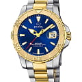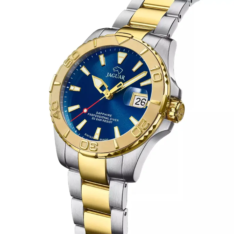 Унисекс швейцарские часы Jaguar Couple Diver J970/2. Кварцевый швейцарский калибр Ronda 6003.d. Сапфировое стеклоСапфировое стеклоПрочный и надёжный материал из кристалла сапфира синтетического происхождения, характеризующийся особой твёрдостью и устойчивостью к царапинам и повреждениям. устойчивое к мелким механическим повреждениям. Корпус часов изготовлен из нержавеющей стали. Стрелки и метки с люминесцентным покрытиемЛюминесцентное покрытиеПозволяет считывать показания времени в темноте. Производители наносят на стрелки, часовые индексы, безель или поверхность циферблата светонакопительный состав, дающий холодное свечение.. Окошко даты находится в положении 3 часа. Класс водозащиты: 200 метров, позволит плавать, нырять и заниматься другими водными видами спорта. Стальной браслет с частичным PVD-покрытиемPVDУльтратонкое покрытие наносится в технике вакуумного напыления, сочетает в себе нитрид титана особой прочности со слоем золота или оксида хрома. Несёт в себе декоративную или защитную функцию. на раскладной застёжкеРаскладная застёжкаТакой тип застёжки используется только на браслетах из металла. Она никогда не раскрывается полностью, происходит разделение на 2 и более частей. Раскладывающая застёжка снизит вероятность потери часов к минимуму.. БезельБезельВнешний ободок, закрепляющий стекло. В спортивных часах так называется поворотное кольцо с делениями на циферблате, выполняет роль таймера – замеряет отрезки времени на шкале. Неподвижный безель – элемент декора. Однонаправленно вращающийся безель на дайверских часах позволяет фиксировать моменты погружения и выныривания на поверхность. с PVD-покрытиемPVDУльтратонкое покрытие наносится в технике вакуумного напыления, сочетает в себе нитрид титана особой прочности со слоем золота или оксида хрома. Несёт в себе декоративную или защитную функцию..