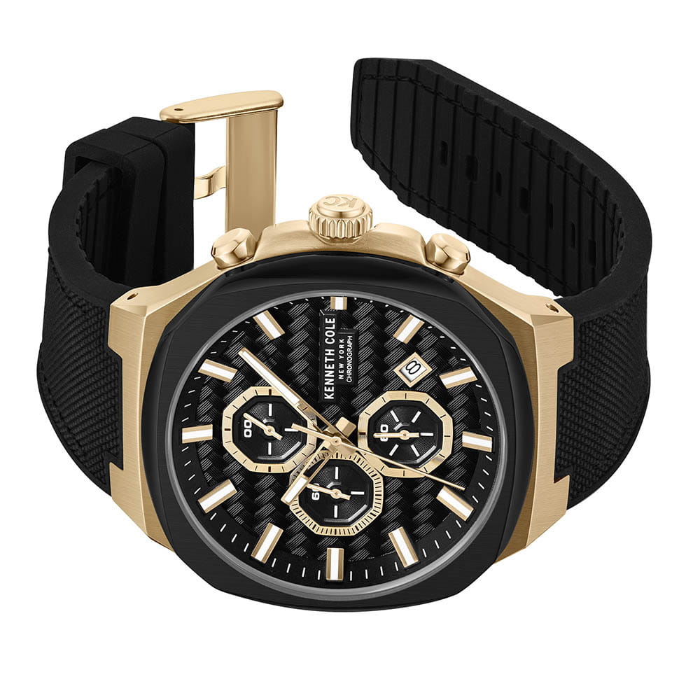 Мужские кварцевые часы Kenneth Cole KCWGO0059602 — это стильный и функциональный аксессуар с современным дизайном. Корпус размером 43 мм выполнен из нержавеющей стали с IP-покрытиемIP-покрытиеМетод ионного напыления. Демонстрирует повышенную устойчивость к истиранию, окислению и химическим веществам. Под воздействием высокого давления и температуры около 1500°C молекулы металла надёжно соединяются с частицами корпуса часов. золотого и чёрного цвета, придающим модели спортивный характер. Циферблат чёрного цвета оформлен метками в виде штрихов и дополнен функциями хронографаХронографФункция позволяет измерять отрезки времени с особой точностью: часы, минуты, секунды. Верным признаком хронографа является наличие на циферблате 3 дополнительных окошек-счётчиков. и индикации даты. Стрелки и метки оснащены люминесцентным покрытиемЛюминесцентное покрытиеПозволяет считывать показания времени в темноте. Производители наносят на стрелки, часовые индексы, безель или поверхность циферблата светонакопительный состав, дающий холодное свечение., обеспечивающим хорошую читаемость в темноте. Циферблат защищён минеральным стекломМинеральное стеклоМинеральное стекло представляет собой искусственно выращенный минерал кварца. Такое стекло отличается особой устойчивостью к повреждениям и царапинам. Уступает по некоторым качествам сапфировому стеклу.. Часы оснащены комбинированным ремешком из силикона и нейлона чёрного цвета с классической пряжкой. Водонепроницаемость 50 м позволяет использовать часы для плавания и повседневного ношения. Надёжный выбор для тех, кто ценит выносливость, стиль и функциональность.