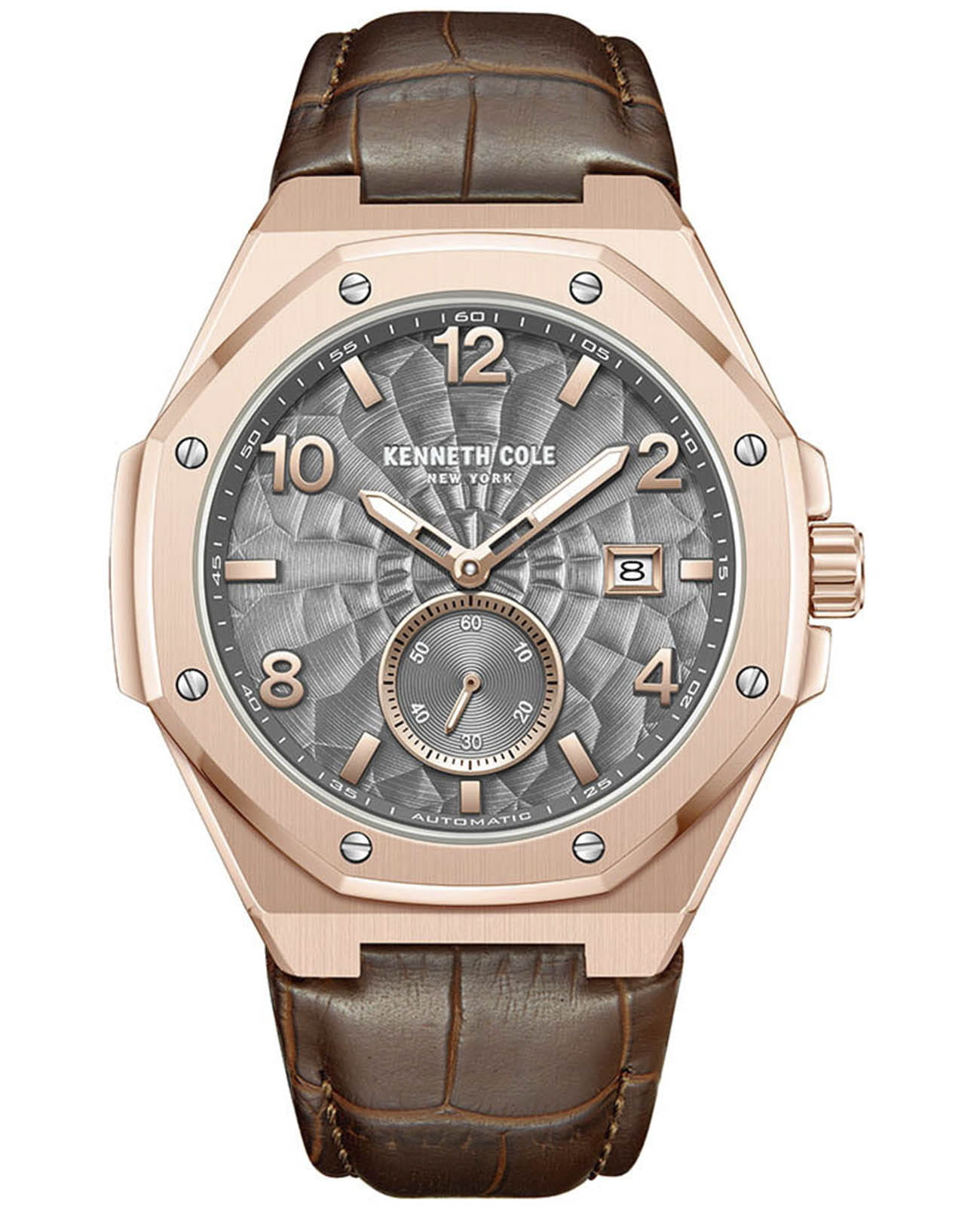 Мужские механические часы с автоподзаводом Kenneth Cole KCWGX0059002 — это стильный и современный аксессуар с выразительным дизайном. Корпус размером 43 × 50 мм выполнен из стали с IP-покрытиемIP-покрытиеМетод ионного напыления. Демонстрирует повышенную устойчивость к истиранию, окислению и химическим веществам. Под воздействием высокого давления и температуры около 1500°C молекулы металла надёжно соединяются с частицами корпуса часов. розового золота. Циферблат серого цвета оформлен метками в виде арабских цифр и штрихов, а секундная стрелка вынесена на отдельный малый циферблат. Окошко даты расположено в положении 3 часов. Циферблат защищён минеральным стекломМинеральное стеклоМинеральное стекло представляет собой искусственно выращенный минерал кварца. Такое стекло отличается особой устойчивостью к повреждениям и царапинам. Уступает по некоторым качествам сапфировому стеклу.. Часы оснащены ремешком из натуральной кожи коричневого цвета с классической пряжкой. Водонепроницаемость 50 м позволяет использовать часы для плавания и повседневного ношения.