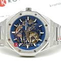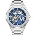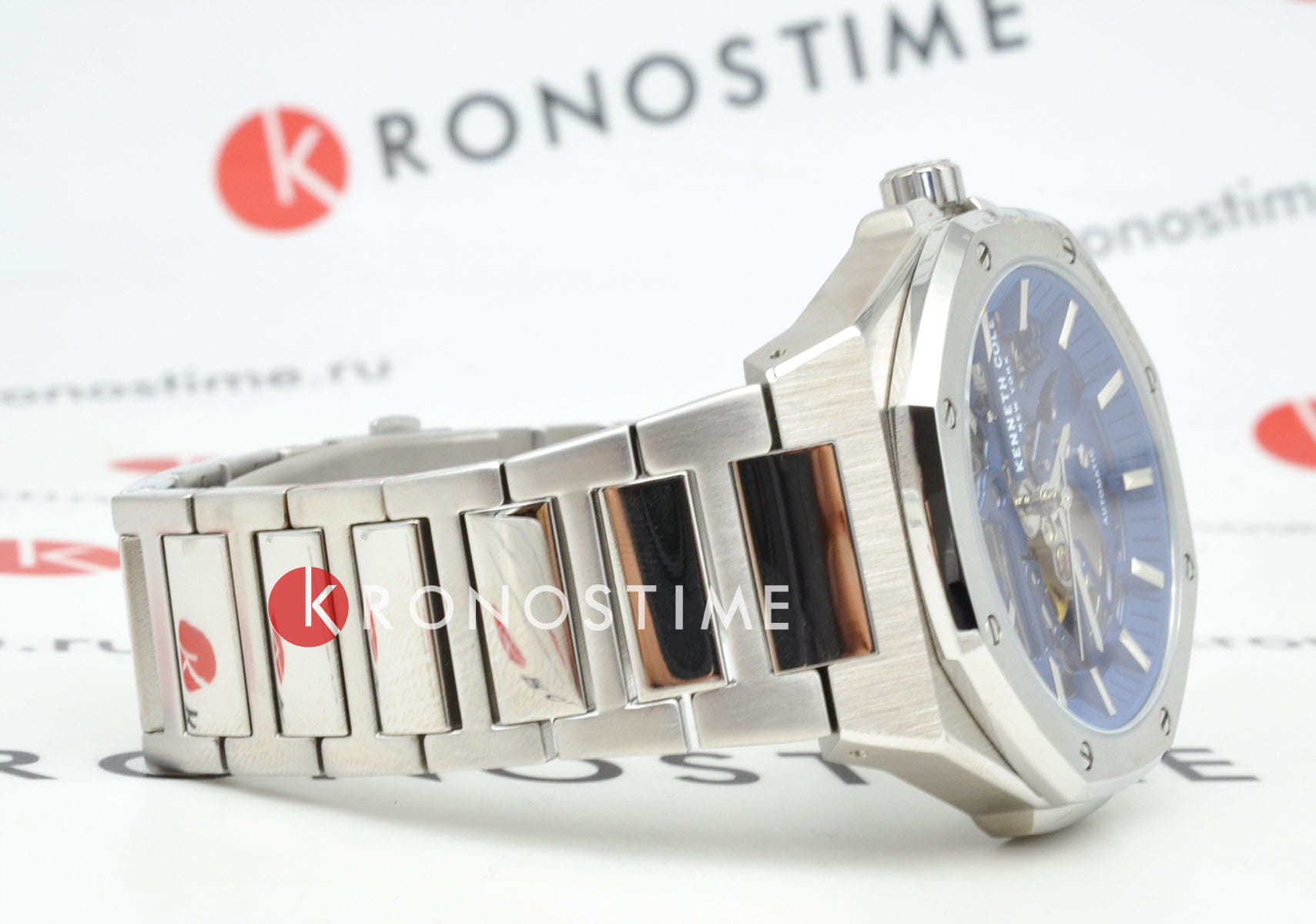Мужские механические часы с автоподзаводом Kenneth Cole KCWGY0058901 — это стильный и современный аксессуар с выразительным дизайном. Корпус размером 42 мм выполнен из стали. Циферблат синего цвета частично скелетонизирован, что позволяет наблюдать за работой механизма. Циферблат защищён минеральным стекломМинеральное стеклоМинеральное стекло представляет собой искусственно выращенный минерал кварца. Такое стекло отличается особой устойчивостью к повреждениям и царапинам. Уступает по некоторым качествам сапфировому стеклу. и оформлен метками в виде штрихов. Часы оснащены стальным браслетом с раскладной застёжкойРаскладная застёжкаТакой тип застёжки используется только на браслетах из металла. Она никогда не раскрывается полностью, происходит разделение на 2 и более частей. Раскладывающая застёжка снизит вероятность потери часов к минимуму.. Водонепроницаемость 50 м позволяет использовать часы для плавания и повседневного ношения.