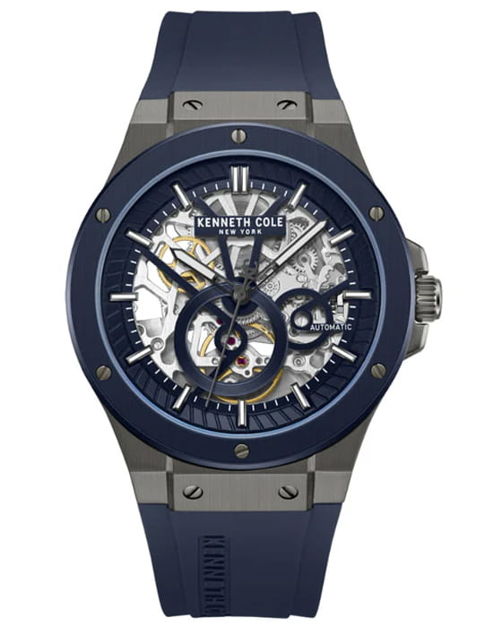 Kenneth Cole KCWGZ0080803 — мужская механическая модель с мощным дизайном и открытым скелетонизированным циферблатом. Круглый корпус из нержавеющей стали выполнен с тёмным PVDPVDУльтратонкое покрытие наносится в технике вакуумного напыления, сочетает в себе нитрид титана особой прочности со слоем золота или оксида хрома. Несёт в себе декоративную или защитную функцию.-покрытием и декорирован винтами на безелеБезельВнешний ободок, закрепляющий стекло. В спортивных часах так называется поворотное кольцо с делениями на циферблате, выполняет роль таймера – замеряет отрезки времени на шкале. Неподвижный безель – элемент декора. Однонаправленно вращающийся безель на дайверских часах позволяет фиксировать моменты погружения и выныривания на поверхность., что подчёркивает индустриальный характер часов. Циферблат открывает вид на работу механизма, создавая эффект глубины и технической изысканности. Метки и стрелки покрыты люминесцентным покрытиемЛюминесцентное покрытиеПозволяет считывать показания времени в темноте. Производители наносят на стрелки, часовые индексы, безель или поверхность циферблата светонакопительный состав, дающий холодное свечение., обеспечивающим читаемость даже в условиях слабого освещения. Защитную функцию выполняет минеральное стеклоМинеральное стеклоМинеральное стекло представляет собой искусственно выращенный минерал кварца. Такое стекло отличается особой устойчивостью к повреждениям и царапинам. Уступает по некоторым качествам сапфировому стеклу., стойкое к повседневным повреждениям. Часы комплектуются силиконовым ремешком с классической застёжкой, который обеспечивает комфорт и стильное сочетание с массивным корпусом. Модель объединяет выразительный скелетон-дизайн и современный характер, становясь эффектным акцентом в мужском образе.