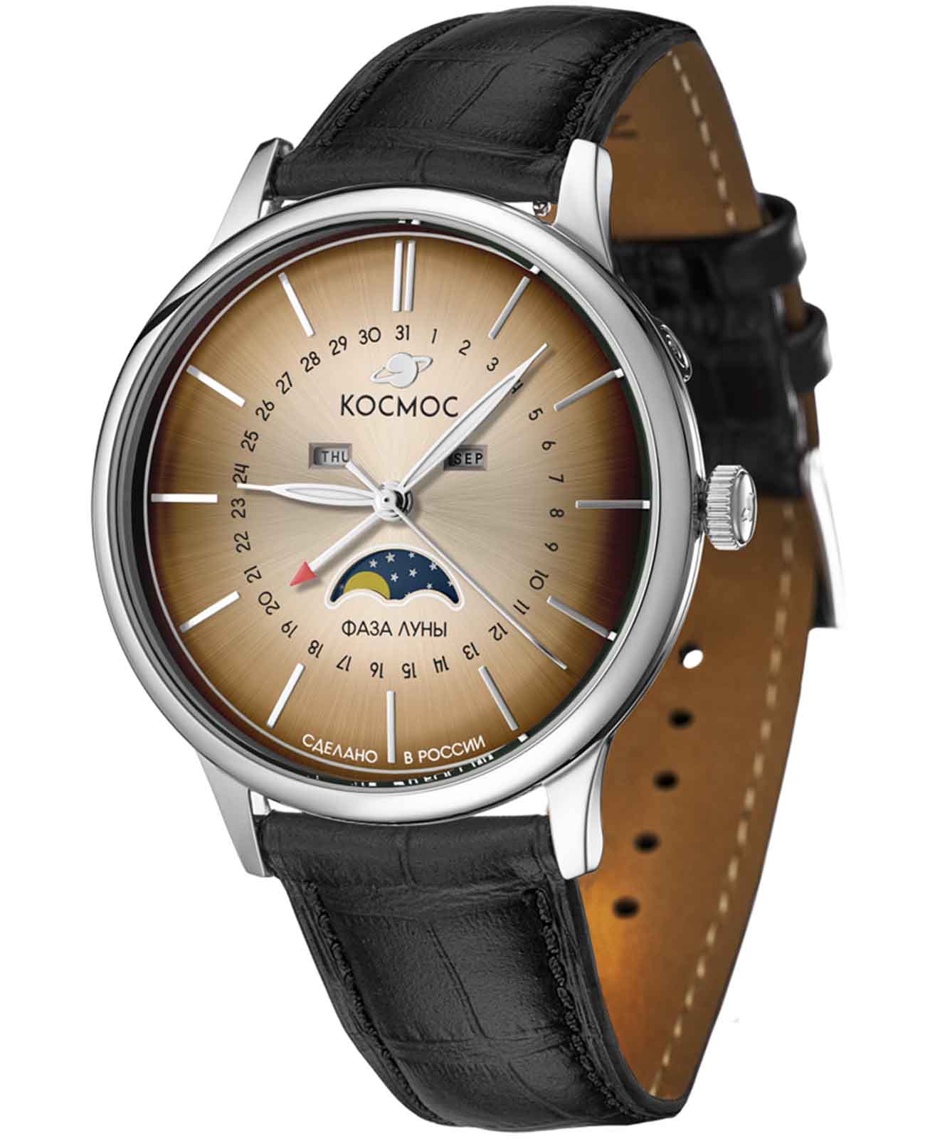 Российские кварцевые часы Космос K067.11.30 из коллекции Сатурн оснащены механизмом калибра Miyota. Круглый корпус из стали диаметром 41 мм защищен минеральным стекломМинеральное стеклоМинеральное стекло представляет собой искусственно выращенный минерал кварца. Такое стекло отличается особой устойчивостью к повреждениям и царапинам. Уступает по некоторым качествам сапфировому стеклу. повышенной прочности. Коричневый циферблат дополнен функциями отображения даты центральной стрелкой, дня недели, месяца и фаз Луны. Стрелки с люминесцентным покрытиемЛюминесцентное покрытиеПозволяет считывать показания времени в темноте. Производители наносят на стрелки, часовые индексы, безель или поверхность циферблата светонакопительный состав, дающий холодное свечение. обеспечивают хорошую видимость в темное время суток. Часы имеют водонепроницаемость 50 метров, позволит защитить корпус от случайных брызг или капель дождя. Модель комплектуется кожаным ремешком на стандартной застежке. Практичный и стильный дизайн делает эти часы идеальным выбором для современного ритма жизни, сочетая в себе функциональность и элегантность.