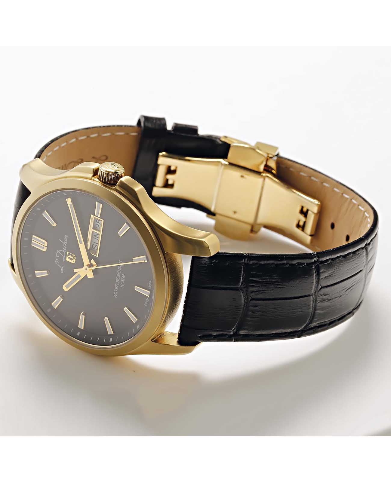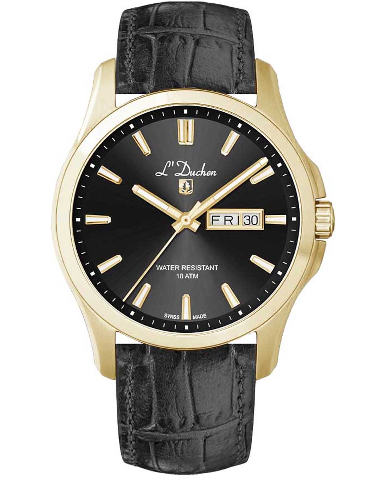 Мужские швейцарские часы L'Duchen Dynamique D 261.21.31, кварцевый механизм с высокой точностью. Сапфировое стеклоСапфировое стеклоПрочный и надёжный материал из кристалла сапфира синтетического происхождения, характеризующийся особой твёрдостью и устойчивостью к царапинам и повреждениям. устойчивое к появлению царапин, обладающее высокой прозрачностью. Корпус часов выполнен из нержавеющей стали с PVD-покрытиемPVDУльтратонкое покрытие наносится в технике вакуумного напыления, сочетает в себе нитрид титана особой прочности со слоем золота или оксида хрома. Несёт в себе декоративную или защитную функцию.. Стрелки с люминесцентным покрытиемЛюминесцентное покрытиеПозволяет считывать показания времени в темноте. Производители наносят на стрелки, часовые индексы, безель или поверхность циферблата светонакопительный состав, дающий холодное свечение.. Класс водозащиты: 100 метров, позволит плавать, нырять и заниматься другими водными видами спорта. Кожаный ремешок на застёжке «бабочка» с кнопкамиЗастёжка "бабочка"Такой вид застёжки дополняется предохранителями, помогающими избежать случайного раскрытия браслета. Обладают изящным исполнением. .