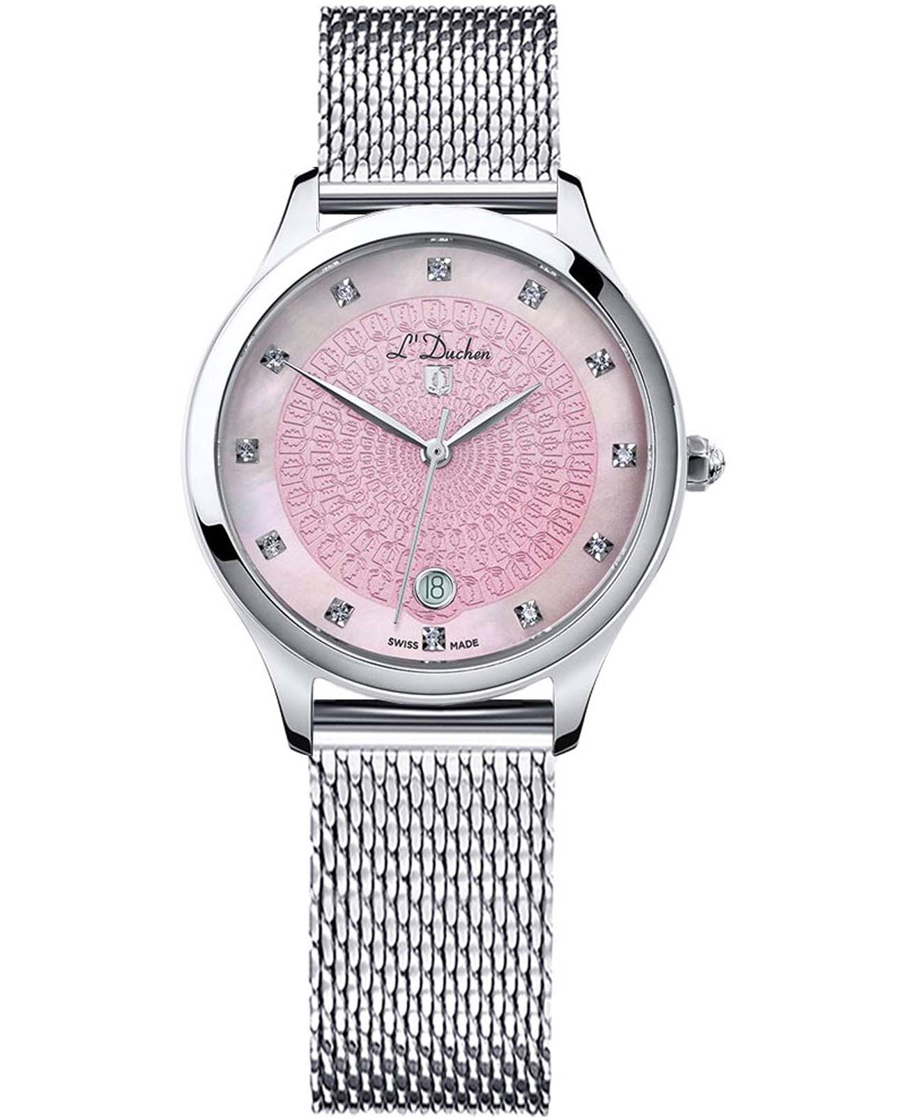 Женские швейцарские часы L'Duchen Grace D 791.17.39 M, кварцевый механизм с высокой точностью. Сапфировое стеклоСапфировое стеклоПрочный и надёжный материал из кристалла сапфира синтетического происхождения, характеризующийся особой твёрдостью и устойчивостью к царапинам и повреждениям. устойчивое к появлению царапин, обладающее высокой прозрачностью. Корпус часов выполнен из нержавеющей стали. Окошко даты находится в положении 6 часов. Класс водозащиты: 50 метров, позволит защитить корпус от случайных брызг или капель дождя. Стальной браслет миланского плетения на раскладном замкеРаскладной замокДанный вариант застежки используется только на часах с металлическим браслетом. Отличительная особенность такого крепления в том, что длина браслета становится универсальной и вы можете самостоятельно отрегулировать нужный вам размер – застежка просто двигается по браслету часов..