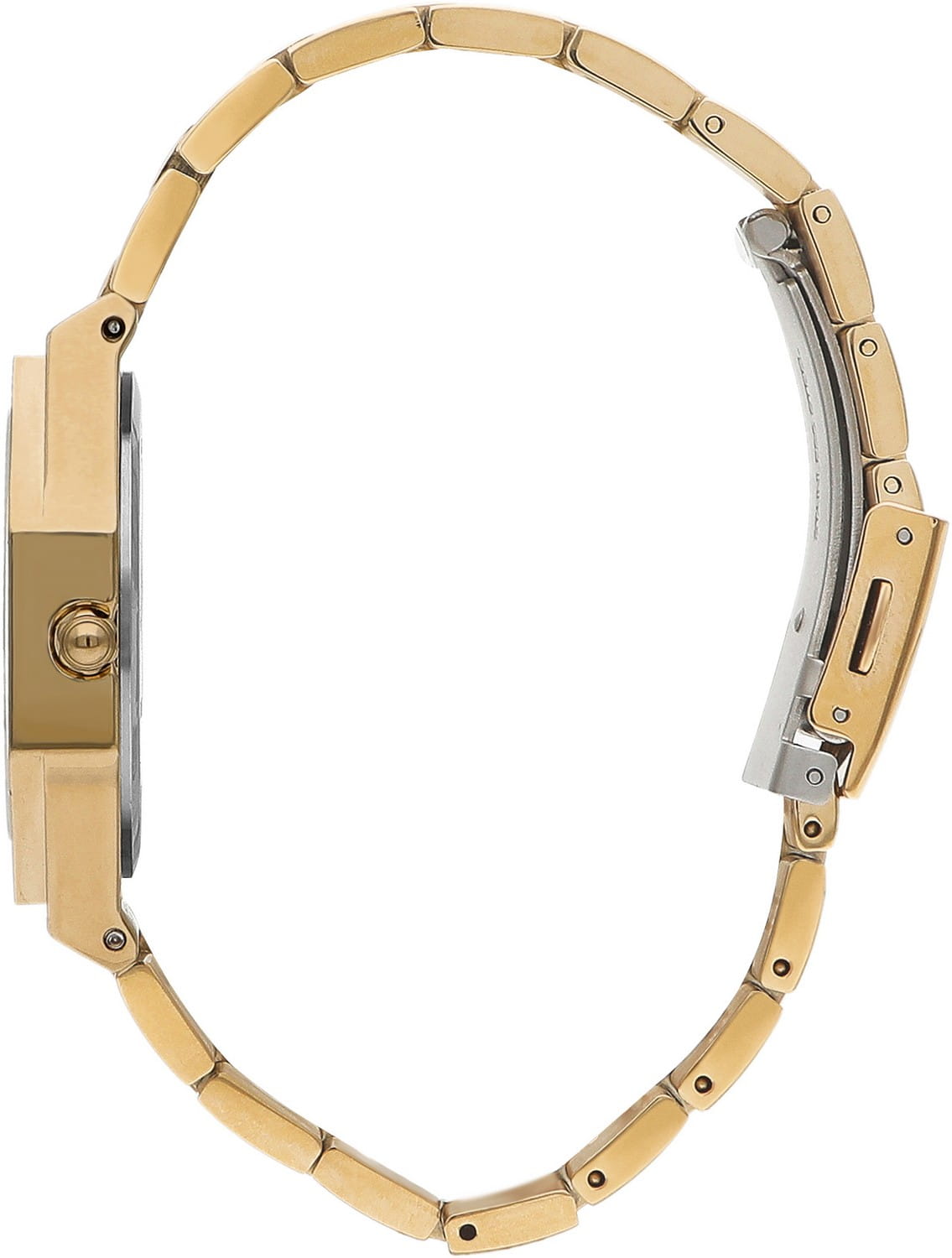 Женские часы Lee Cooper LC07599.110 — это стильное сочетание элегантности и современного дизайна. Круглый корпус диаметром 35 мм выполнен из суперметалла с IP-покрытиемIP-покрытиеМетод ионного напыления. Демонстрирует повышенную устойчивость к истиранию, окислению и химическим веществам. Под воздействием высокого давления и температуры около 1500°C молекулы металла надёжно соединяются с частицами корпуса часов. золотистого цвета. Циферблат защищен минеральным стекломМинеральное стеклоМинеральное стекло представляет собой искусственно выращенный минерал кварца. Такое стекло отличается особой устойчивостью к повреждениям и царапинам. Уступает по некоторым качествам сапфировому стеклу., обеспечивающий устойчивость к царапинам. Неподвижный безельБезельВнешний ободок, закрепляющий стекло. В спортивных часах так называется поворотное кольцо с делениями на циферблате, выполняет роль таймера – замеряет отрезки времени на шкале. Неподвижный безель – элемент декора. Однонаправленно вращающийся безель на дайверских часах позволяет фиксировать моменты погружения и выныривания на поверхность. и циферблат инкрустированы цирконами. Центральные часовая, минутная и секундная стрелки. Часы оснащены надежным кварцевым механизмом, источник питания - батарейка. Металлический браслет на раскладной застёжкеРаскладная застёжкаТакой тип застёжки используется только на браслетах из металла. Она никогда не раскрывается полностью, происходит разделение на 2 и более частей. Раскладывающая застёжка снизит вероятность потери часов к минимуму. гарантирует комфортную посадку на запястье. Водозащита 30 метров защищает модель от случайных брызг и дождя. Lee Cooper — отличный выбор для тех, кто ценит утонченность и качество.