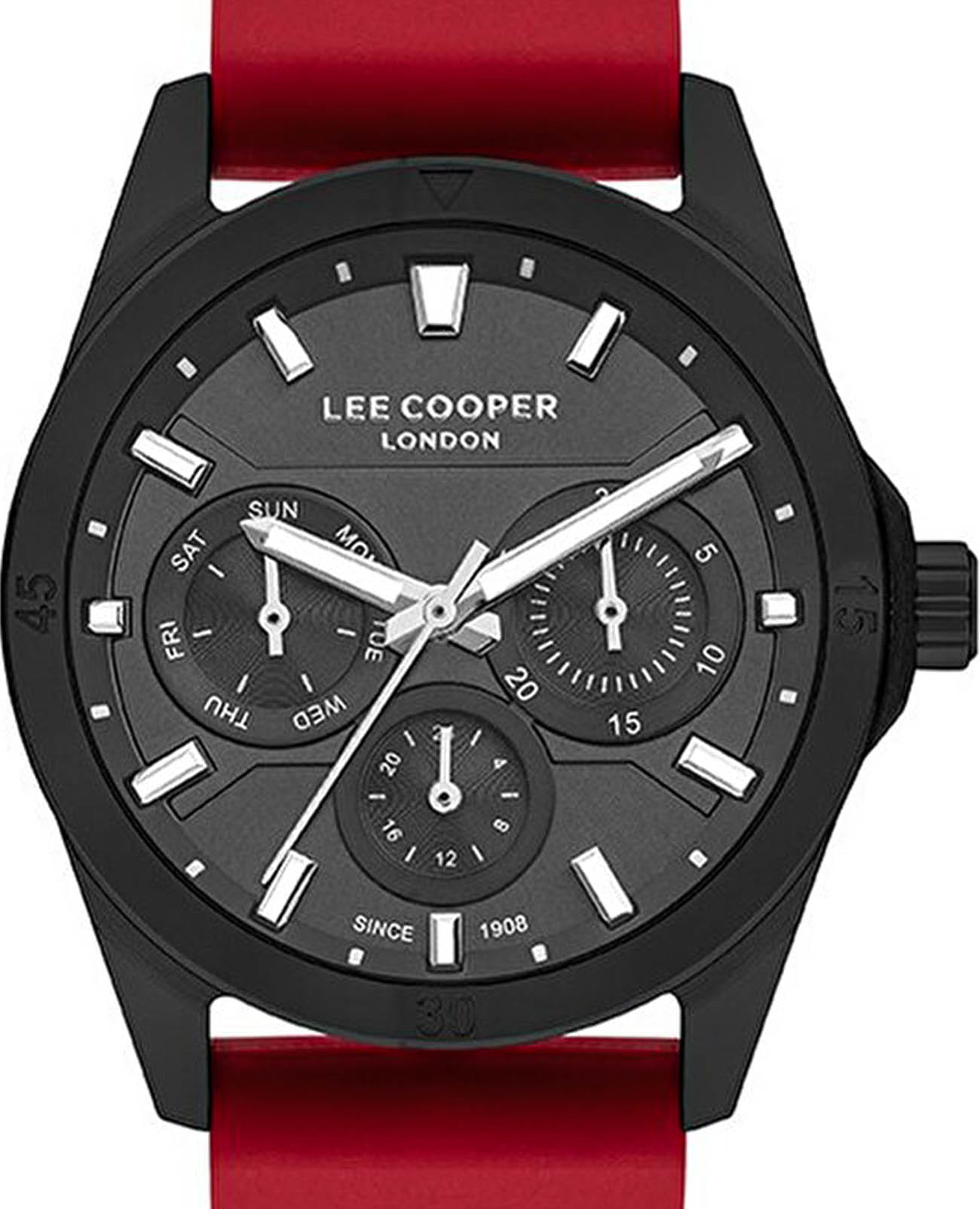 Женские кварцевые часы Lee Cooper LC07625.668 — это мультифункциональный аксессуар с лаконичным дизайном. Корпус диаметром 36 мм выполнен из суперметалла с IP-покрытиемIP-покрытиеМетод ионного напыления. Демонстрирует повышенную устойчивость к истиранию, окислению и химическим веществам. Под воздействием высокого давления и температуры около 1500°C молекулы металла надёжно соединяются с частицами корпуса часов. чёрного цвета. Циферблат чёрного цвета оформлен индексами и дополнен окошками даты, дня недели и 24-часового индикатора. Циферблат защищён минеральным стекломМинеральное стеклоМинеральное стекло представляет собой искусственно выращенный минерал кварца. Такое стекло отличается особой устойчивостью к повреждениям и царапинам. Уступает по некоторым качествам сапфировому стеклу.. Стрелки и метки с люминесцентным покрытиемЛюминесцентное покрытиеПозволяет считывать показания времени в темноте. Производители наносят на стрелки, часовые индексы, безель или поверхность циферблата светонакопительный состав, дающий холодное свечение., обеспечивающим хорошую читаемость в темноте. Часы оснащены силиконовым ремешком красного цвета с классической пряжкой. Водонепроницаемость 30 м позволяет использовать часы в повседневных условиях, защищая от случайных брызг и капель дождя. Универсальный выбор для тех, кто ценит функциональность и надёжность.