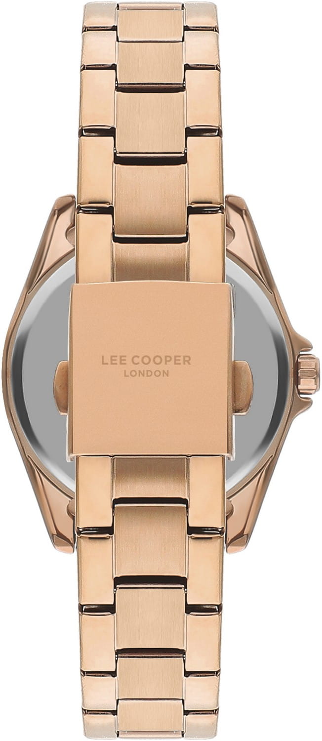 Женские часы Lee Cooper LC07685.410 — это стильное сочетание элегантности и современного дизайна. Круглый корпус диаметром 36 мм выполнен из суперметалла с IP-покрытиемIP-покрытиеМетод ионного напыления. Демонстрирует повышенную устойчивость к истиранию, окислению и химическим веществам. Под воздействием высокого давления и температуры около 1500°C молекулы металла надёжно соединяются с частицами корпуса часов., придающий модели особый блеск. Золотисто-розовый циферблат с золотыми индексами защищен минеральным стекломМинеральное стеклоМинеральное стекло представляет собой искусственно выращенный минерал кварца. Такое стекло отличается особой устойчивостью к повреждениям и царапинам. Уступает по некоторым качествам сапфировому стеклу., обеспечивающим устойчивость к царапинам. Часы оснащены надежным кварцевым механизмом, а стальной браслет с IP-покрытиемIP-покрытиеМетод ионного напыления. Демонстрирует повышенную устойчивость к истиранию, окислению и химическим веществам. Под воздействием высокого давления и температуры около 1500°C молекулы металла надёжно соединяются с частицами корпуса часов. на раскладной застёжкеРаскладная застёжкаТакой тип застёжки используется только на браслетах из металла. Она никогда не раскрывается полностью, происходит разделение на 2 и более частей. Раскладывающая застёжка снизит вероятность потери часов к минимуму. гарантирует комфортную посадку на запястье. Мультифункциональная модель с индикацией даты, дня недели, с дополнительным 24-х часовым индикатором. Водозащита 30 метров защищает модель от случайных брызг и дождя. Lee Cooper — это идеальный выбор для тех, кто ценит классический стиль, точность механизма и качество материалов в одном аксессуаре.