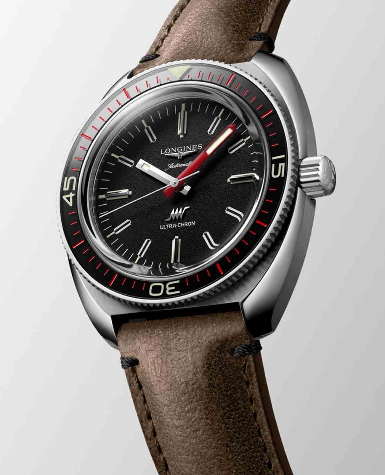 Мужские швейцарские механические часы Longines Ultra‑Chron L2.836.4.52.2. Сапфировое стеклоСапфировое стеклоПрочный и надёжный материал из кристалла сапфира синтетического происхождения, характеризующийся особой твёрдостью и устойчивостью к царапинам и повреждениям. с антибликовым покрытием, устойчивое к мелким механическим повреждениям. БезелемБезельВнешний ободок, закрепляющий стекло. В спортивных часах так называется поворотное кольцо с делениями на циферблате, выполняет роль таймера – замеряет отрезки времени на шкале. Неподвижный безель – элемент декора. Однонаправленно вращающийся безель на дайверских часах позволяет фиксировать моменты погружения и выныривания на поверхность. с керамической вставкой. Стрелки и метки с люминесцентнымЛюминесцентное покрытиеПозволяет считывать показания времени в темноте. Производители наносят на стрелки, часовые индексы, безель или поверхность циферблата светонакопительный состав, дающий холодное свечение. покрытием. Запас хода до 52 часов. Класс водозащиты: 300 метров, позволит плавать, нырять и заниматься другими водными видами спорта. Кожаный ремешок на стандартной застежке.