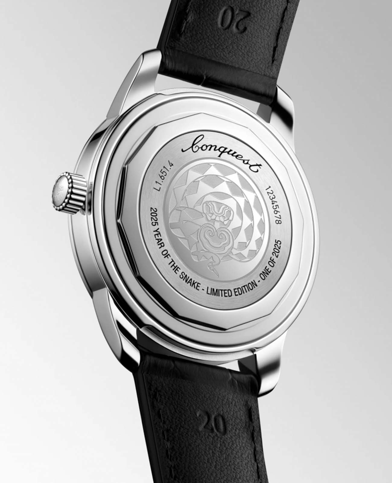 Мужские швейцарские наручные часы с автоподзаводом Longines Heritage Year Of The Snake Edition L1.651.4.09.2. Корпус часов изготовлен из нержавеющей стали. Сапфировое стеклоСапфировое стеклоПрочный и надёжный материал из кристалла сапфира синтетического происхождения, характеризующийся особой твёрдостью и устойчивостью к царапинам и повреждениям. устойчивое к мелким механическим повреждениям. Стрелки с люминесцентным покрытиемЛюминесцентное покрытиеПозволяет считывать показания времени в темноте. Производители наносят на стрелки, часовые индексы, безель или поверхность циферблата светонакопительный состав, дающий холодное свечение. Super-LumiNova. Механизм с автоматическим подзаводом работает от амплитуды движения руки. Класс водозащиты: 50 метров, позволит защитить корпус от случайных брызг или капель дождя. Часы укомплектованы кожаным ремешком с простой застежкой из титана, превосходно дополняющим эксклюзивный образ модели. Ограниченная серия (Limited Edition) 2025 шт. Калибр L888.5. Запас хода до 72 часов.
