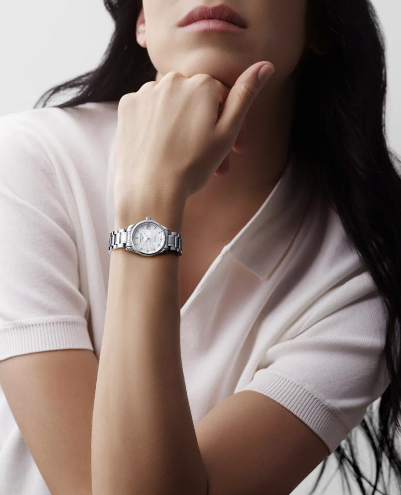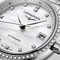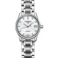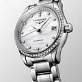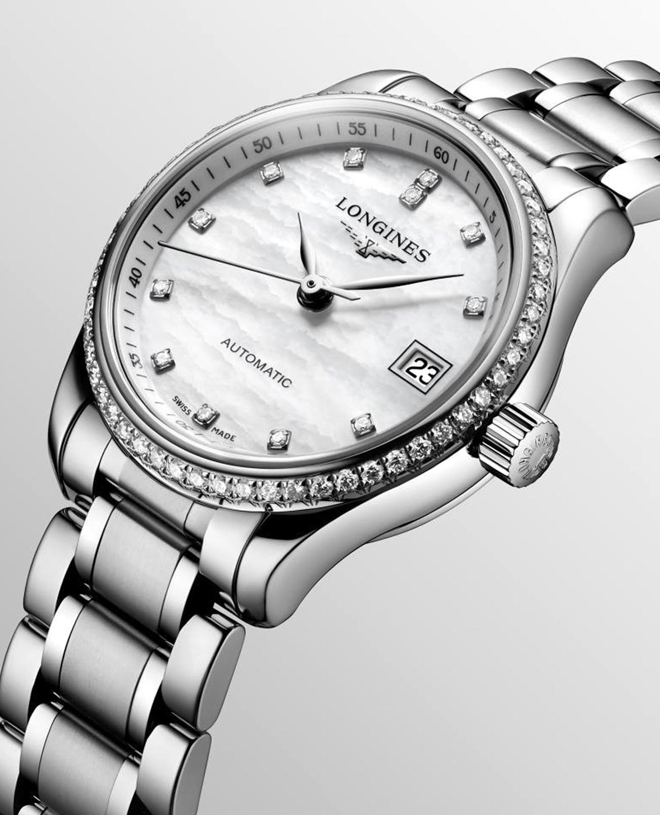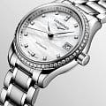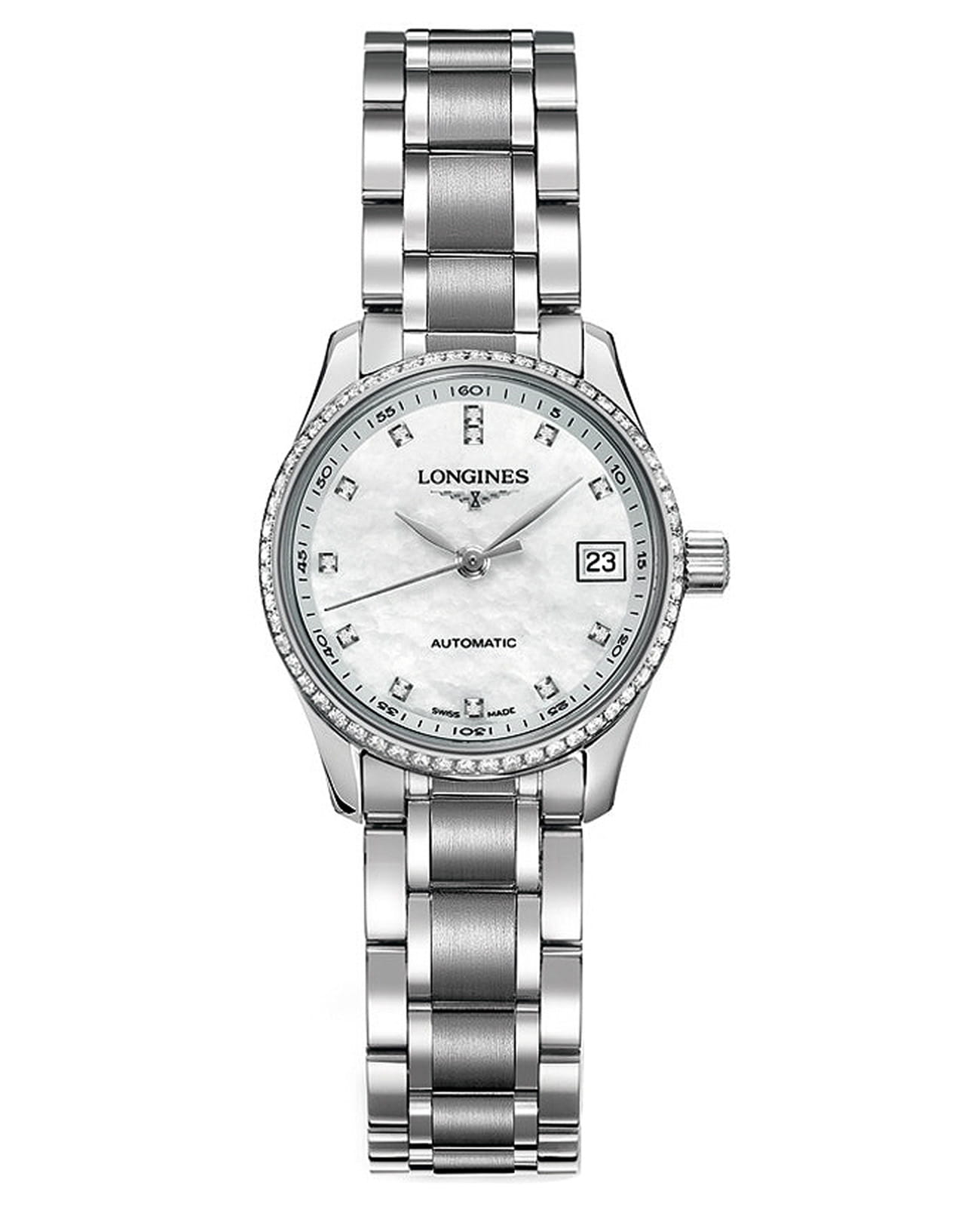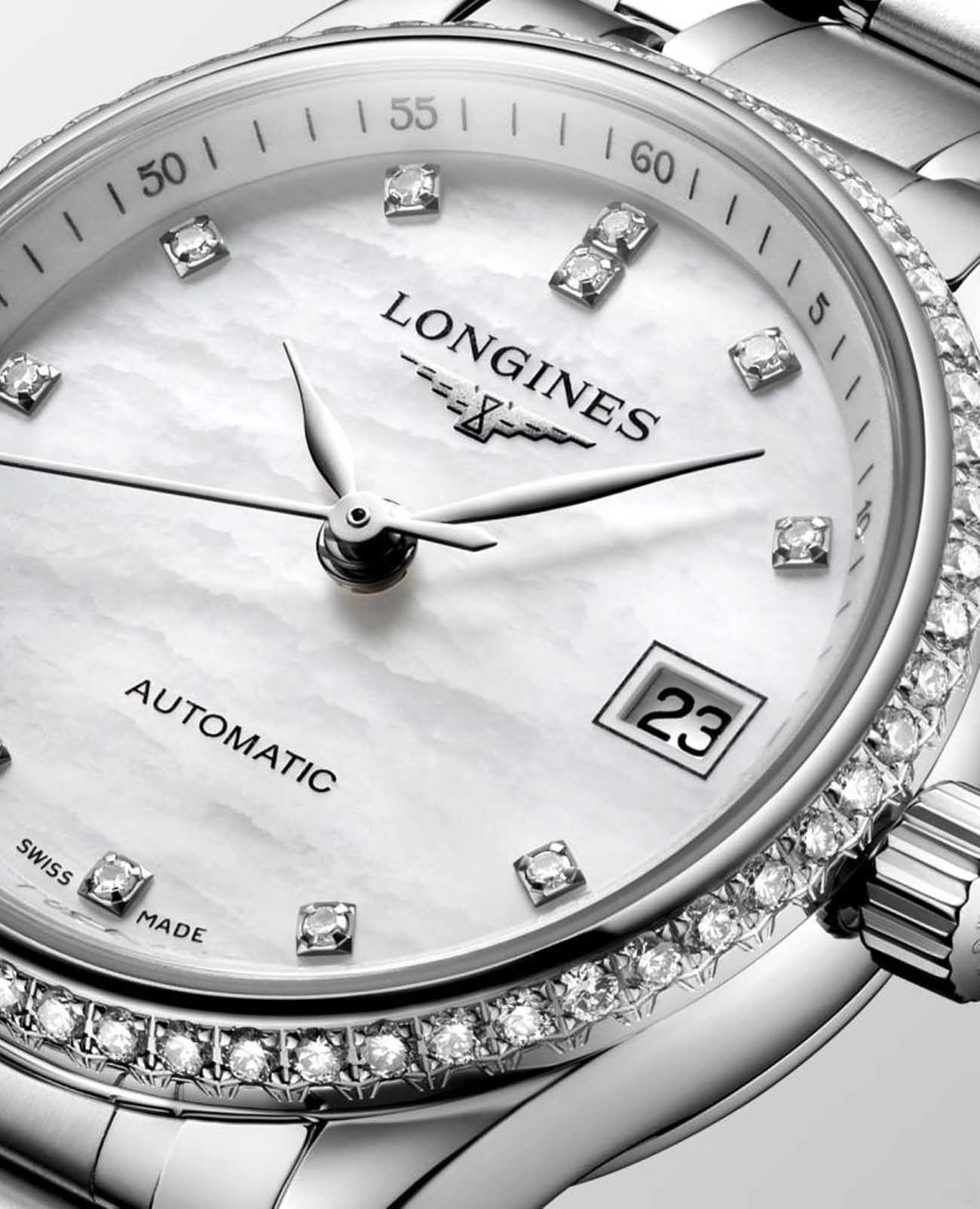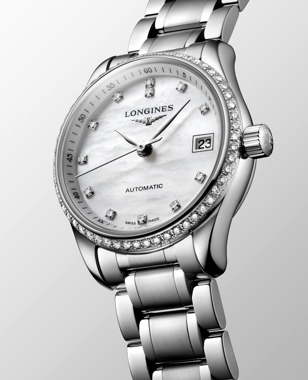 Женские швейцарские механические часы с автоподзаводом Longines Master Collection L2.128.0.87.6. Сапфировое стеклоСапфировое стеклоПрочный и надёжный материал из кристалла сапфира синтетического происхождения, характеризующийся особой твёрдостью и устойчивостью к царапинам и повреждениям. устойчивое к появлению царапин, обладающее высокой прозрачностью. Корпус часов изготовлен из нержавеющей стали. БезельБезельВнешний ободок, закрепляющий стекло. В спортивных часах так называется поворотное кольцо с делениями на циферблате, выполняет роль таймера – замеряет отрезки времени на шкале. Неподвижный безель – элемент декора. Однонаправленно вращающийся безель на дайверских часах позволяет фиксировать моменты погружения и выныривания на поверхность. украшен бриллиантами.  Циферблат инкрустирован 12 бриллиантами 0,41 карата. Окошко даты в положении 3 часов. Прозрачная задняя крышка. Класс водозащиты: 30 метров, позволит защитить корпус от случайных брызг или капель дождя. Стальной браслет на застёжке «бабочка» с кнопкамиЗастёжка "бабочка"Такой вид застёжки дополняется предохранителями, помогающими избежать случайного раскрытия браслета. Обладают изящным исполнением. .