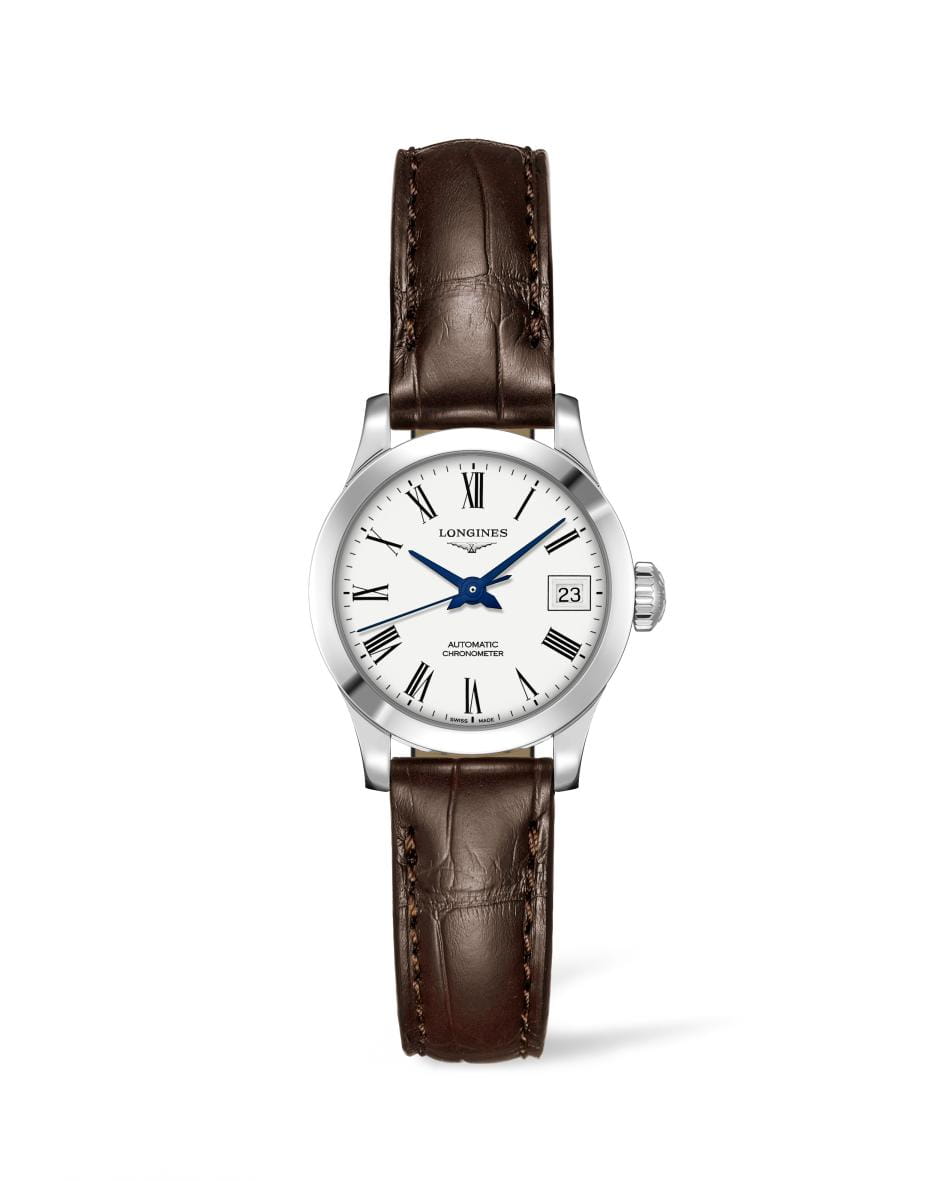 Женские швейцарские механические часы Longines Record Collection L2.320.4.11.2 – аксессуар в классическом стиле. Сапфировое стеклоСапфировое стеклоПрочный и надёжный материал из кристалла сапфира синтетического происхождения, характеризующийся особой твёрдостью и устойчивостью к царапинам и повреждениям. дополнено антибликовым покрытиемАнтибликовое покрытиеСлой оксида металла в 0,13-0,3 микрон, благодаря которому стекло часов не бликует и не отражает свет. Антибликовое покрытие уменьшает отражение света в 10 раз, обеспечивая отличную читаемость показателей циферблата.. Корпус часов выполнен из нержавеющей стали. Швейцарский автоматический механизм L592.4 с резервом хода до 45 часов за высокую точность хода отмечен официальным сертификатом хронометра COSCСертификат COSCОфициальный сертификат, подтверждающий то, что часы ходят с особо высокой точностью. Для получения документа часы подвергаются тестовым испытаниям, разработанным швейцарским институтом тестирования хронометров COSC. Допустимая норма для механических часов -4/+6 секунд в день, для кварцевых моделей +/- 0,07 секунд в день.. Ремешок выполнен из натуральной кожи аллигатора. Ремешок из кожи аллигатора на раскладной застёжкеРаскладная застёжкаТакой тип застёжки используется только на браслетах из металла. Она никогда не раскрывается полностью, происходит разделение на 2 и более частей. Раскладывающая застёжка снизит вероятность потери часов к минимуму..