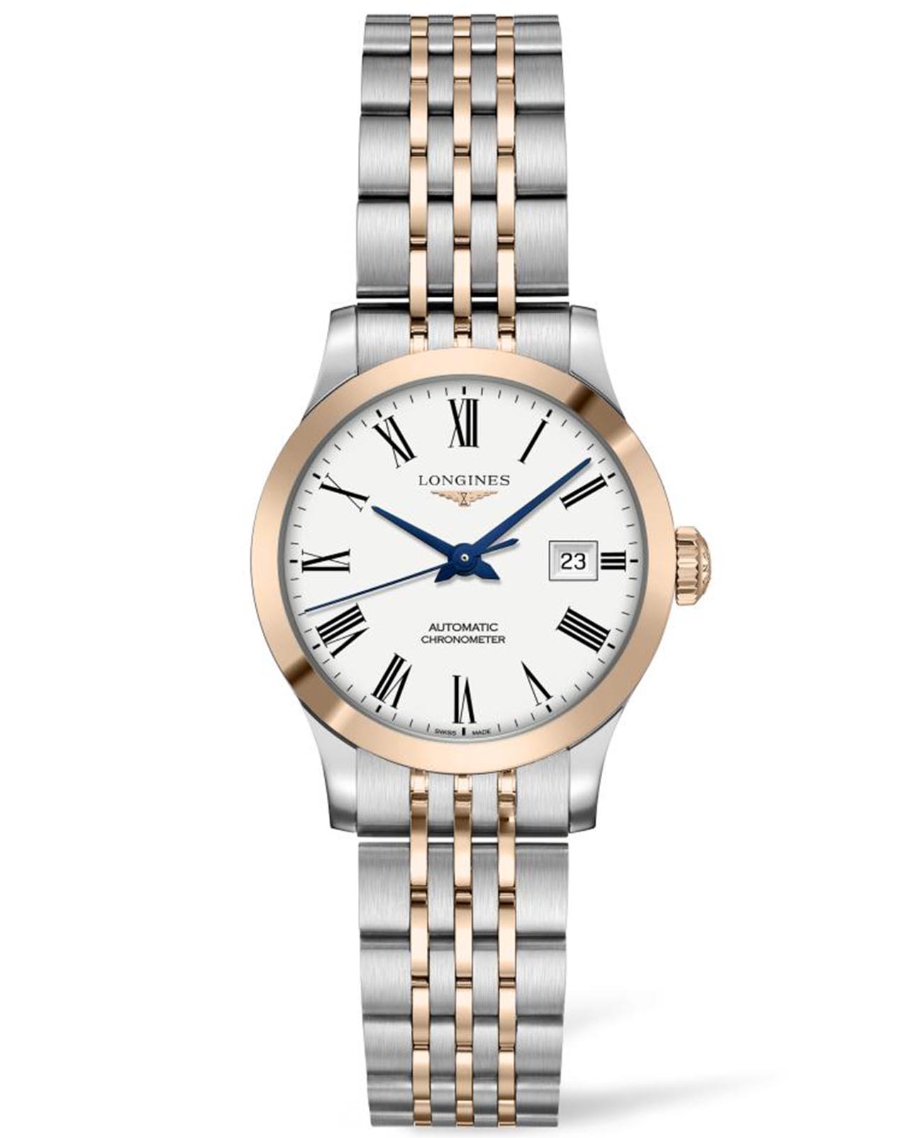 Женские швейцарские механические часы Longines Record Collection L2.321.5.11.7 – идеальное украшение образа. Швейцарский автоматический механизм L592.4 с резервом хода до 40 часов за высокую точность хода отмечен официальным сертификатом хронометра COSCСертификат COSCОфициальный сертификат, подтверждающий то, что часы ходят с особо высокой точностью. Для получения документа часы подвергаются тестовым испытаниям, разработанным швейцарским институтом тестирования хронометров COSC. Допустимая норма для механических часов -4/+6 секунд в день, для кварцевых моделей +/- 0,07 секунд в день.. Сапфировое стеклоСапфировое стеклоПрочный и надёжный материал из кристалла сапфира синтетического происхождения, характеризующийся особой твёрдостью и устойчивостью к царапинам и повреждениям. дополнено антибликовым покрытиемАнтибликовое покрытиеСлой оксида металла в 0,13-0,3 микрон, благодаря которому стекло часов не бликует и не отражает свет. Антибликовое покрытие уменьшает отражение света в 10 раз, обеспечивая отличную читаемость показателей циферблата.. Корпус выполнен из стали. БезельБезельВнешний ободок, закрепляющий стекло. В спортивных часах так называется поворотное кольцо с делениями на циферблате, выполняет роль таймера – замеряет отрезки времени на шкале. Неподвижный безель – элемент декора. Однонаправленно вращающийся безель на дайверских часах позволяет фиксировать моменты погружения и выныривания на поверхность. из 18-ти каратного золота18-каратное золотоОбозначение по каратной системе пробирования, оно показывает, сколько драгоценного металла содержится в изделии. 18 карат - в составе 75% чистого золота, соответствует 750 пробе.