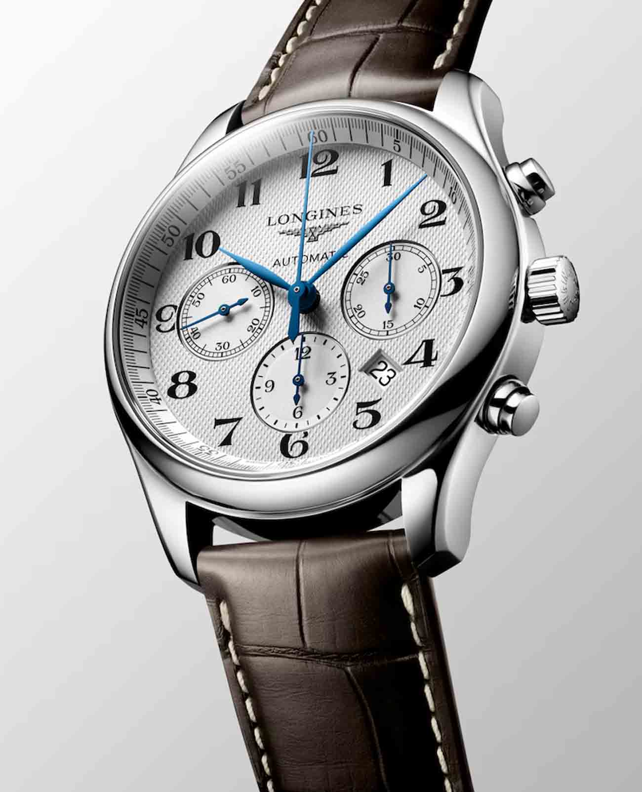 Мужсике швейцарские механические часы-хронографХронографФункция позволяет измерять отрезки времени с особой точностью: часы, минуты, секунды. Верным признаком хронографа является наличие на циферблате 3 дополнительных окошек-счётчиков. с автоподзаводом Longines Master Collection L2.759.4.78.3. Сапфировое стеклоСапфировое стеклоПрочный и надёжный материал из кристалла сапфира синтетического происхождения, характеризующийся особой твёрдостью и устойчивостью к царапинам и повреждениям. устойчивое к появлению царапин, обладающее высокой прозрачностью. Корпус часов изготовлен из нержавеющей стали. Механизм хронографа: центральная секундная стрелка, 30-минутный счетчик в положении «3 часа», 12-часовой счетчик в положении «6 часов». Прозрачная задняя крышка. Автоматический механизм с частотой баланса 28 800 полуколебаний в час и запасом хода, которого хватает примерно на 60 часов работы. Класс водозащиты: 30 метров, позволит защитить корпус от случайных брызг или капель дождя. Автоматический механизм с частотой баланса 28 800 полуколебаний в час и запасом хода, которого хватает примерно на 60 часов работы. Ремешок из кожи аллигатора на застёжке «бабочка» с кнопкамиЗастёжка "бабочка"Такой вид застёжки дополняется предохранителями, помогающими избежать случайного раскрытия браслета. Обладают изящным исполнением. .