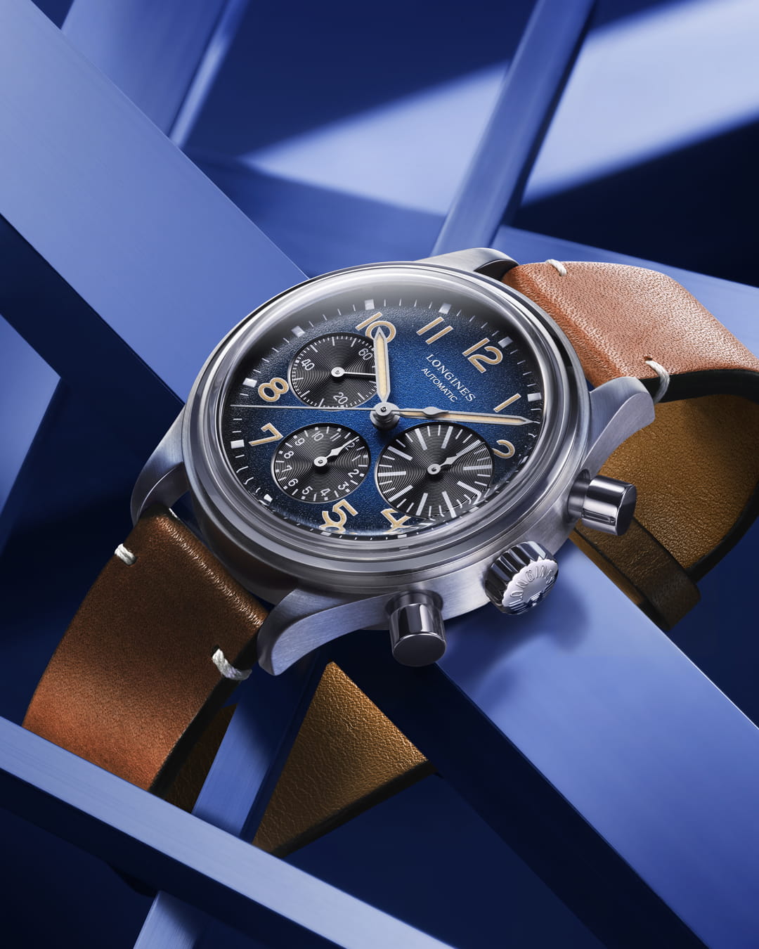 Часы, минуты и малая секундная стрелка в положении «9 часов» дополняют функциональность хронографаХронографФункция позволяет измерять отрезки времени с особой точностью: часы, минуты, секунды. Верным признаком хронографа является наличие на циферблате 3 дополнительных окошек-счётчиков.. Центральные секундная стрелка, 30-минутный счётчик в положении «3 часа» и 12-часовой счётчик в положении «6 часов» позволяют точно измерять время и фиксировать моменты.