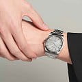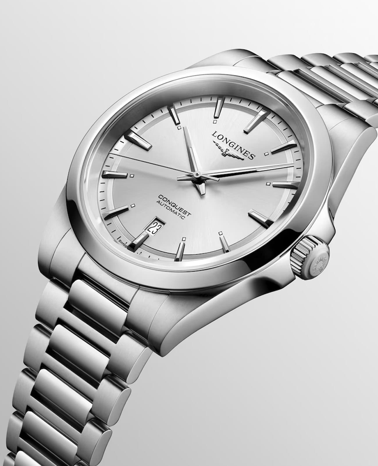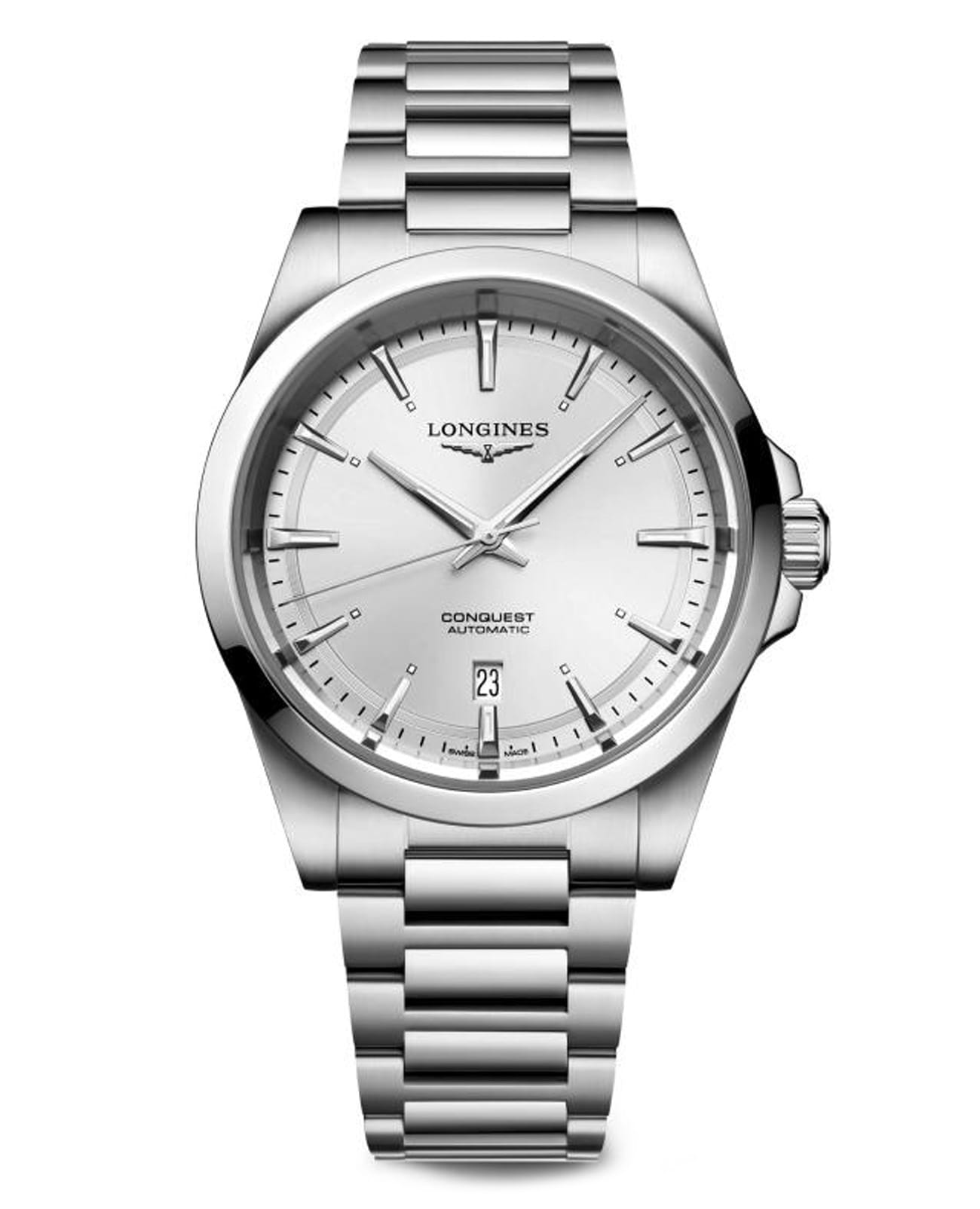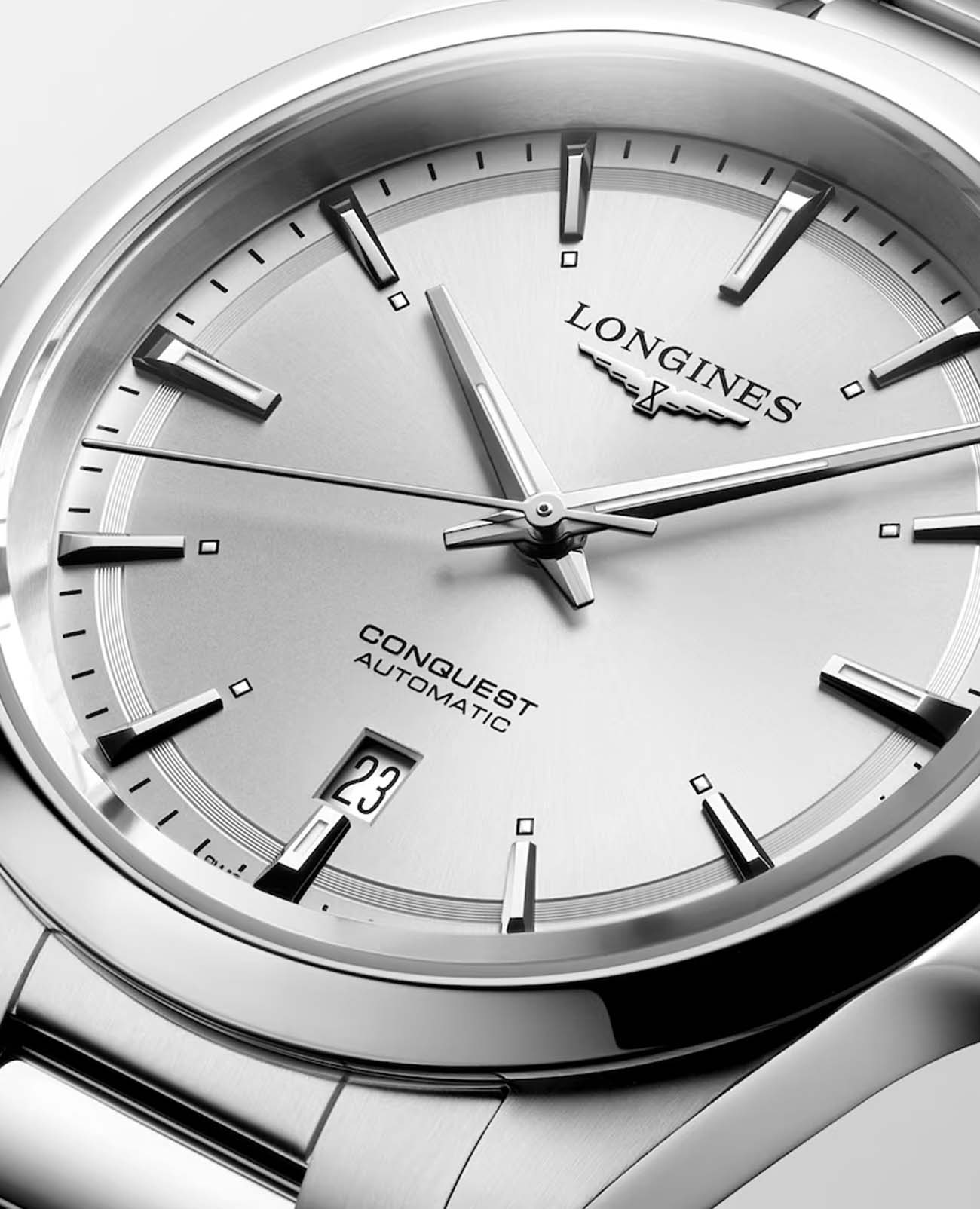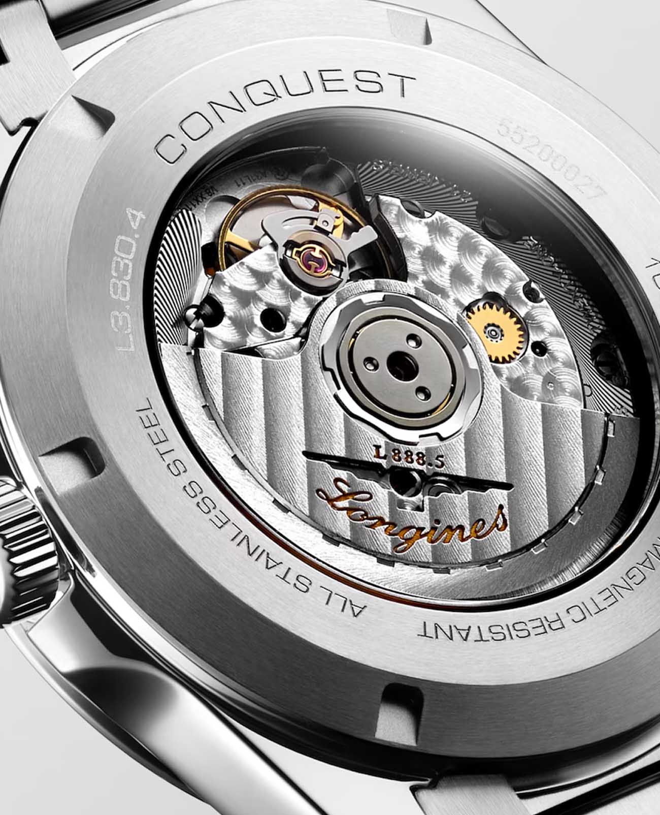Мужские швейцарские механические часы с автоподзаводом Longines Conquest L3.830.4.72.6. Сапфировое стеклоСапфировое стеклоПрочный и надёжный материал из кристалла сапфира синтетического происхождения, характеризующийся особой твёрдостью и устойчивостью к царапинам и повреждениям. устойчивое к появлению царапин, обладающее высокой прозрачностью. Корпус часов изготовлен из нержавеющей стали. Циферблат выполнен по технологии Sunray (солнечные лучи). Стрелки и метки с люминесцентным покрытиемЛюминесцентное покрытиеПозволяет считывать показания времени в темноте. Производители наносят на стрелки, часовые индексы, безель или поверхность циферблата светонакопительный состав, дающий холодное свечение.. Окошко даты в положении 6 часов. Прозрачная задняя крышка. Класс водозащиты: 100 метров, позволит плавать, нырять и заниматься другими водными видами спорта. Стальной браслет на раскладной застёжкеРаскладная застёжкаТакой тип застёжки используется только на браслетах из металла. Она никогда не раскрывается полностью, происходит разделение на 2 и более частей. Раскладывающая застёжка снизит вероятность потери часов к минимуму..