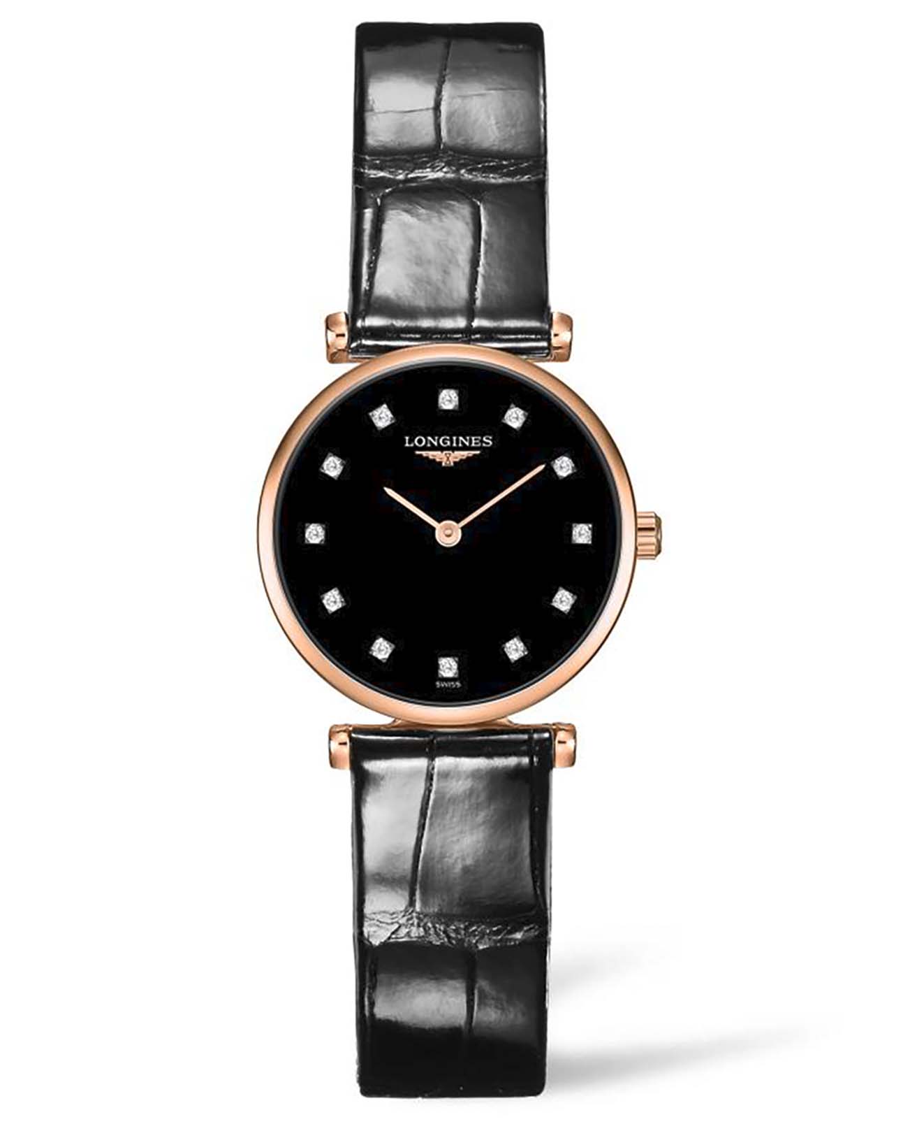 Компактный чёрный циферблат украшен 12 бриллиантами общим весом 0,048 карата. Элегантным дополнением стал ремешок из кожи аллигатора. Швейцарский кварцевый калибр L209 обеспечивает высокую точность хода. Сапфировое стекло не допускает появления царапин на поверхности.