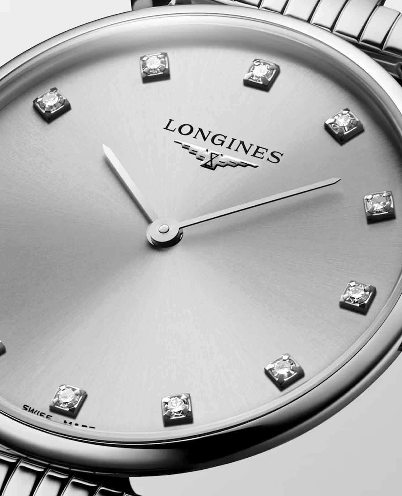 Женские швейцарские часы Longines La Grande Classique L4.512.4.70.6, кварцевый механизм с высокой точностью. Сапфировое стеклоСапфировое стеклоПрочный и надёжный материал из кристалла сапфира синтетического происхождения, характеризующийся особой твёрдостью и устойчивостью к царапинам и повреждениям. устойчивое к появлению царапин, обладающее высокой прозрачностью. Корпус часов изготовлен из стали. Циферблат с 12 бриллиантами группы Top Wesselton VS-SI общим весом 0.081 карата. Класс водозащиты: 30 метров, позволит защитить корпус от случайных брызг или капель дождя. Стальной браслет на застёжке-бабочке с кнопкамиЗастёжка "бабочка"Такой вид застёжки дополняется предохранителями, помогающими избежать случайного раскрытия браслета. Обладают изящным исполнением. .