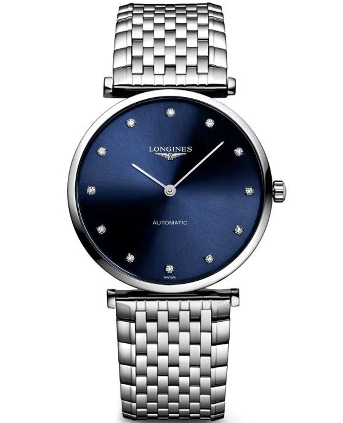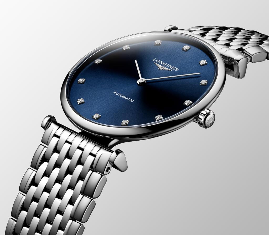 Женские швейцарские часы Longines La Grande Classique L4.908.4.97.6, кварцевый механизм с высокой точностью. Сапфировое стеклоСапфировое стеклоПрочный и надёжный материал из кристалла сапфира синтетического происхождения, характеризующийся особой твёрдостью и устойчивостью к царапинам и повреждениям. устойчивое к появлению царапин, обладающее высокой прозрачностью. Корпус часов изготовлен из стали. Циферблат с 12 бриллиантами группы Top Wesselton VS-SI общим весом 0.081 карата. Класс водозащиты: 30 метров, позволит защитить корпус от случайных брызг или капель дождя. Стальной браслет на застёжке-бабочке с кнопкамиЗастёжка "бабочка"Такой вид застёжки дополняется предохранителями, помогающими избежать случайного раскрытия браслета. Обладают изящным исполнением. .