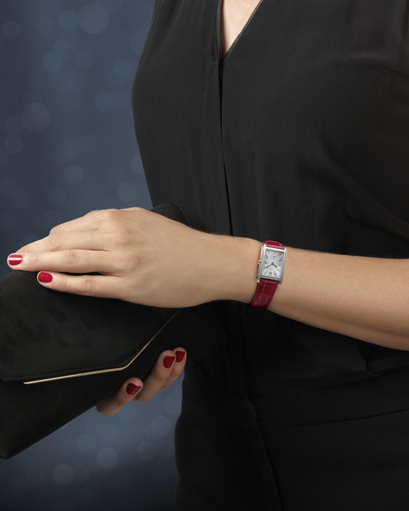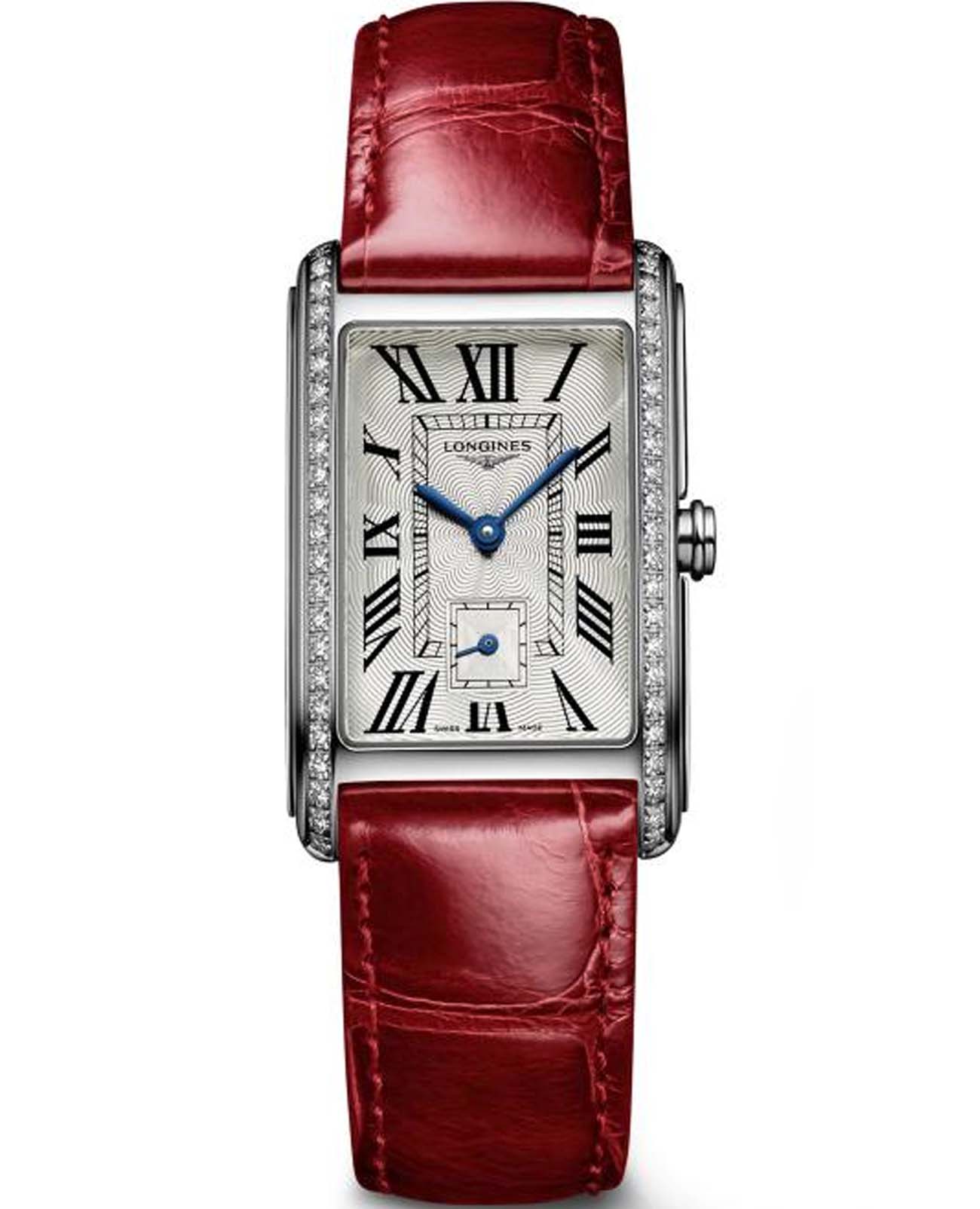 Женские швейцарские часы Longines DolceVita L5.512.0.71.5, кварцевый механизм с высокой точностью. Сапфировое стеклоСапфировое стеклоПрочный и надёжный материал из кристалла сапфира синтетического происхождения, характеризующийся особой твёрдостью и устойчивостью к царапинам и повреждениям. устойчивое к появлению царапин, обладающее высокой прозрачностью. Корпус часов изготовлен из нержавеющей стали с 46 бриллиантами группы Top Wesselton IF-VVS общим весом 0.552 карата. Метки в виде римских цифр. Малая секундная стрелка в положении 6 часов. Класс водозащиты: 30 метров, позволит защитить корпус от случайных брызг или капель дождя. Ремешок из кожи аллигатора на стандартной застежке.