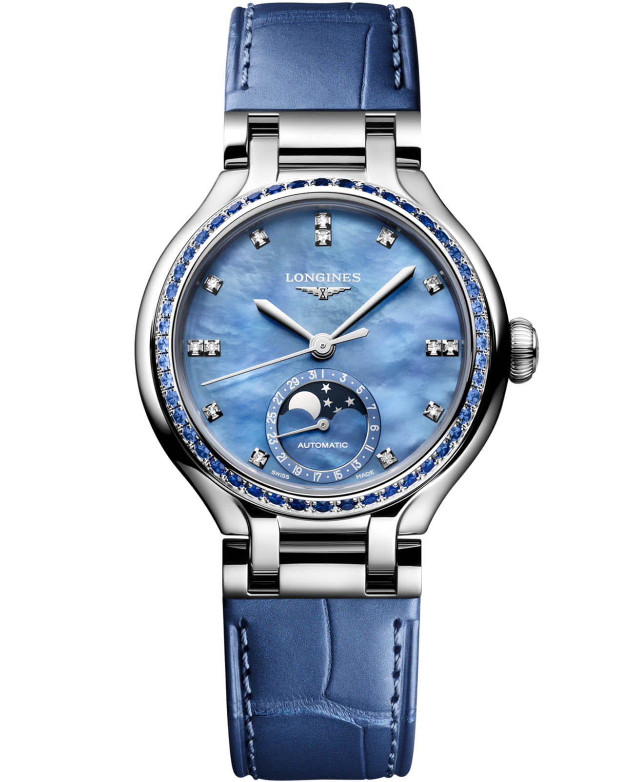 Женские швейцарские часы Longines PrimaLuna Moonphase L8.126.0.97.2 - воплощает элегантность и женственность. Исключительно женственная коллекция, созданная с тщательным вниманием к деталям, она отражает изящность. Сапфировое стеклоСапфировое стеклоПрочный и надёжный материал из кристалла сапфира синтетического происхождения, характеризующийся особой твёрдостью и устойчивостью к царапинам и повреждениям. с антибликовым покрытиемАнтибликовое покрытиеСлой оксида металла в 0,13-0,3 микрон, благодаря которому стекло часов не бликует и не отражает свет. Антибликовое покрытие уменьшает отражение света в 10 раз, обеспечивая отличную читаемость показателей циферблата. устойчивое к появлению царапин, обладающее высокой прозрачностью. Циферблат с 14 бриллиантовыми индексами. Корпус часов изготовлен из нержавеющей стали, диаметром 34 мм и толщиной 11,60 мм, с сапфирами, идеально подходит для изящного запястья. Указатель фазы луны в положении 6 часов. Класс водозащиты: 30 метров позволит защитить корпус от случайных брызг или капель дождя. Кожаный ремень на застёжке «бабочка» с кнопкамиЗастёжка "бабочка"Такой вид застёжки дополняется предохранителями, помогающими избежать случайного раскрытия браслета. Обладают изящным исполнением. обеспечивает комфортную посадку на запястье. Внутри корпуса скрывается надежный автоматический механизм, гарантирующий точность хода и долгий срок службы. Каждая модель Longines PrimaLuna излучает красоту, которая неподвластна мимолетным тенденциям.