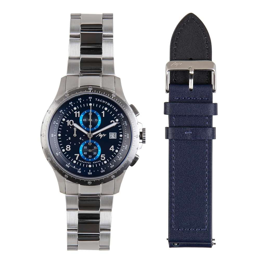 Мужские наручные часы Луч Aviator 740280598 — это стильный хронографХронографФункция позволяет измерять отрезки времени с особой точностью: часы, минуты, секунды. Верным признаком хронографа является наличие на циферблате 3 дополнительных окошек-счётчиков., который сочетает элегантность и современный дизайн. Элегантный корпус диаметром 44 мм выполнен из нержавеющей стали придает модели особый изысканный вид. Циферблат защищен сапфировым стекломСапфировое стеклоПрочный и надёжный материал из кристалла сапфира синтетического происхождения, характеризующийся особой твёрдостью и устойчивостью к царапинам и повреждениям., обеспечивающим устойчивость к царапинам. Метки в виде штрихов и арабских цифр, окошко даты находится в положении 3 часа. Часы оснащены кварцевым механизмом высокой точности, а стальной браслет на раскладной застёжкеРаскладная застёжкаТакой тип застёжки используется только на браслетах из металла. Она никогда не раскрывается полностью, происходит разделение на 2 и более частей. Раскладывающая застёжка снизит вероятность потери часов к минимуму. гарантирует комфортную посадку на запястье. Стрелки с люминесцентным покрытиемЛюминесцентное покрытиеПозволяет считывать показания времени в темноте. Производители наносят на стрелки, часовые индексы, безель или поверхность циферблата светонакопительный состав, дающий холодное свечение. позволяют легко считывать время даже в условиях недостаточного освещения, тахиметрТахиметрРазмеченная шкала, располагается на ободке или безеле часов. Тахиметр позволяет рассчитать скорость на определённом участке пути, расстояние измеряется в километрах или милях. по внешнему краю. Водозащита 100 метров позволит плавать, нырять и заниматься другими водными видами спорта. Луч — отличный выбор для тех, кто ценит утонченность и качество. В комплекте два ремня: кожаный и стальной.