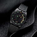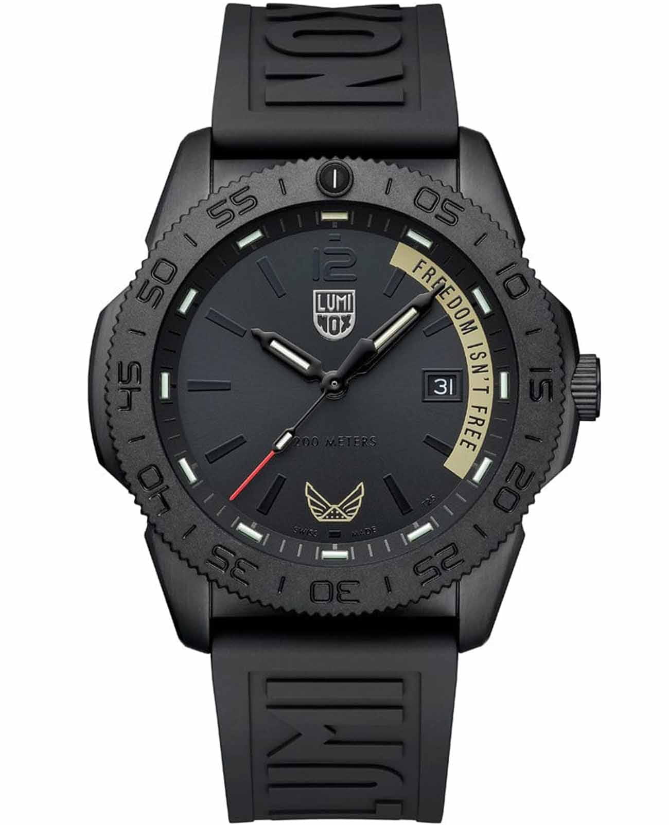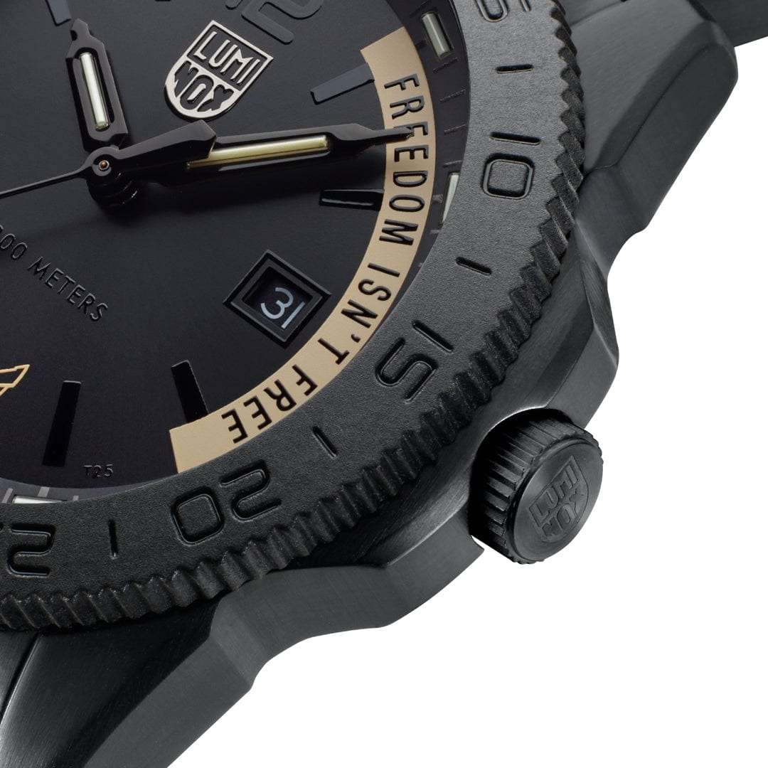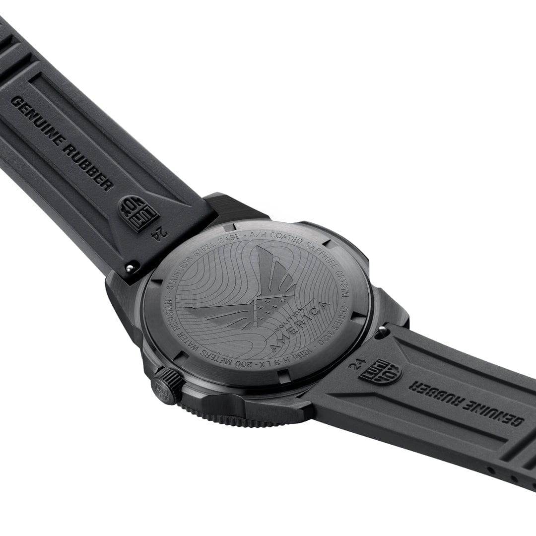 Швейцарские наручные часы Luminox VOLITION AMERICA ‘Freedom Isn't Free' XS.3121.BO.VOL.FR – это идеальный симбиоз стиля и высокой функциональности. Оснащенные высокоточным кварцевым механизмом Ronda 515, они гарантируют безупречное времяизмерение и надежность в любом случае. Циферблат этих часов защищен сапфировым стекломСапфировое стеклоПрочный и надёжный материал из кристалла сапфира синтетического происхождения, характеризующийся особой твёрдостью и устойчивостью к царапинам и повреждениям. с антибликовым покрытиемАнтибликовое покрытиеСлой оксида металла в 0,13-0,3 микрон, благодаря которому стекло часов не бликует и не отражает свет. Антибликовое покрытие уменьшает отражение света в 10 раз, обеспечивая отличную читаемость показателей циферблата., которое славится своей прочностью и устойчивостью к царапинам, обеспечивая кристально чистый обзор. Корпус часов выполнен из качественной стали с черным PVD-покрытиемPVDУльтратонкое покрытие наносится в технике вакуумного напыления, сочетает в себе нитрид титана особой прочности со слоем золота или оксида хрома. Несёт в себе декоративную или защитную функцию., что свидетельствует о долговечности и прочности изделия. Стрелки с LLTLLTLLT — это автономный механизм подсветки, основанный на использовании микроскопических газонаполненных элементов. Специальные герметичные капсулы из боросиликатного стекла, интегрированные в циферблат, генерируют свечение без необходимости подключения к внешним источникам энергии. Для их работы не требуется ни дополнительный свет, ни механическое воздействие (например, нажатие кнопки). Свечение возникает благодаря химическому процессу: реакция между тритием, заключенным в капсулах, и люминофорным покрытием создает стабильное автономное освещение. Технология обеспечивает энергетическую независимость и долговечность подсветки.-подсветкой, обеспечивают отличную видимость даже в условиях недостаточной освещенности, что делает их удобными для использования в любых условиях. Дополнительно часы располагают окошком даты в положении 3 часа, позволяющим быстро и удобно отслеживать текущую дату. Их внушительный класс водозащиты в 200 метров делает их идеальными для любителей водных видов спорта, таких как плавание и ныряние, не беспокоясь о повреждении механизма. Каучуковый ремешок черного цвета, надёжно фиксирующий часы на запястье с помощью раскладной застёжкиРаскладная застёжкаТакой тип застёжки используется только на браслетах из металла. Она никогда не раскрывается полностью, происходит разделение на 2 и более частей. Раскладывающая застёжка снизит вероятность потери часов к минимуму., обеспечивает комфортное ношение в течение всего дня. Стильный вращающийся безельБезельВнешний ободок, закрепляющий стекло. В спортивных часах так называется поворотное кольцо с делениями на циферблате, выполняет роль таймера – замеряет отрезки времени на шкале. Неподвижный безель – элемент декора. Однонаправленно вращающийся безель на дайверских часах позволяет фиксировать моменты погружения и выныривания на поверхность., изготовленный из карбонаКарбонОт «carbon», «carbone» - углерод, углепластик - полимерный композиционный материал из переплетённых под определенным углом между собой нитей углеродного волокна, применяется для изготовления лёгких, но прочных деталей. В часа