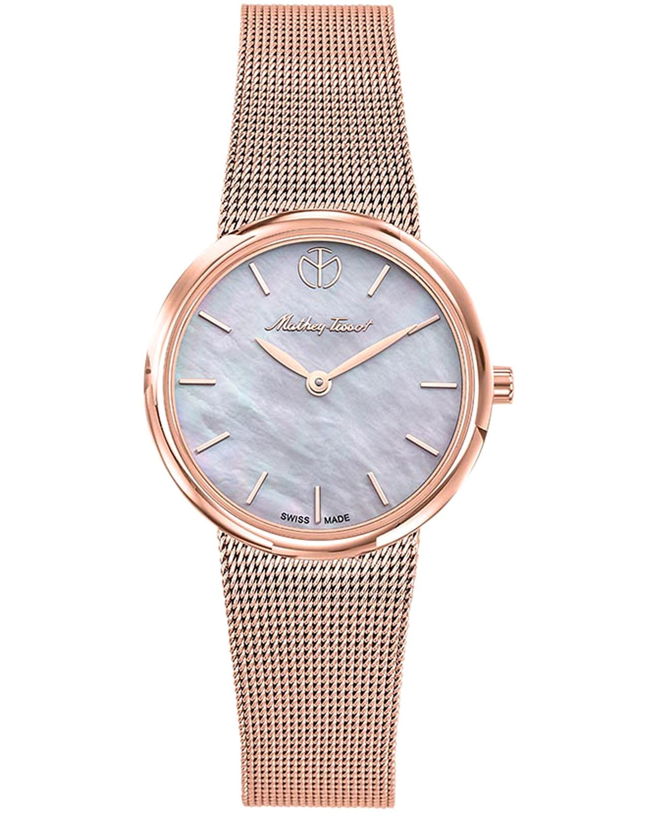 Женские кварцевые часы Mathey-Tissot Milly D403PI — это стильное сочетание элегантности и современного дизайна. Изящный корпус выполнен из нержавеющей стали с PVD-покрытиемPVDУльтратонкое покрытие наносится в технике вакуумного напыления, сочетает в себе нитрид титана особой прочности со слоем золота или оксида хрома. Несёт в себе декоративную или защитную функцию. цвета розового золота, диаметром 30 мм, что придаст образу элегантности и надежности. Изысканный перламутровый циферблат с метками в виде штрихов придает модели особый блеск. Циферблат защищен минеральным стекломМинеральное стеклоМинеральное стекло представляет собой искусственно выращенный минерал кварца. Такое стекло отличается особой устойчивостью к повреждениям и царапинам. Уступает по некоторым качествам сапфировому стеклу. с сапфировым покрытием, обеспечивает устойчивость к царапинам. Часы оснащены надежным кварцевым механизмом. Стальной браслет с PVD-покрытиемPVDУльтратонкое покрытие наносится в технике вакуумного напыления, сочетает в себе нитрид титана особой прочности со слоем золота или оксида хрома. Несёт в себе декоративную или защитную функцию. миланского плетения на раскладном замкеРаскладная застёжкаТакой тип застёжки используется только на браслетах из металла. Она никогда не раскрывается полностью, происходит разделение на 2 и более частей. Раскладывающая застёжка снизит вероятность потери часов к минимуму., гарантирует комфортное и безопасное ношение. Класс водозащиты: 30 метров позволит защитить корпус от случайных брызг или капель дождя. Mathey-Tissot  — отличный выбор для тех, кто ценит утонченность и качество.
